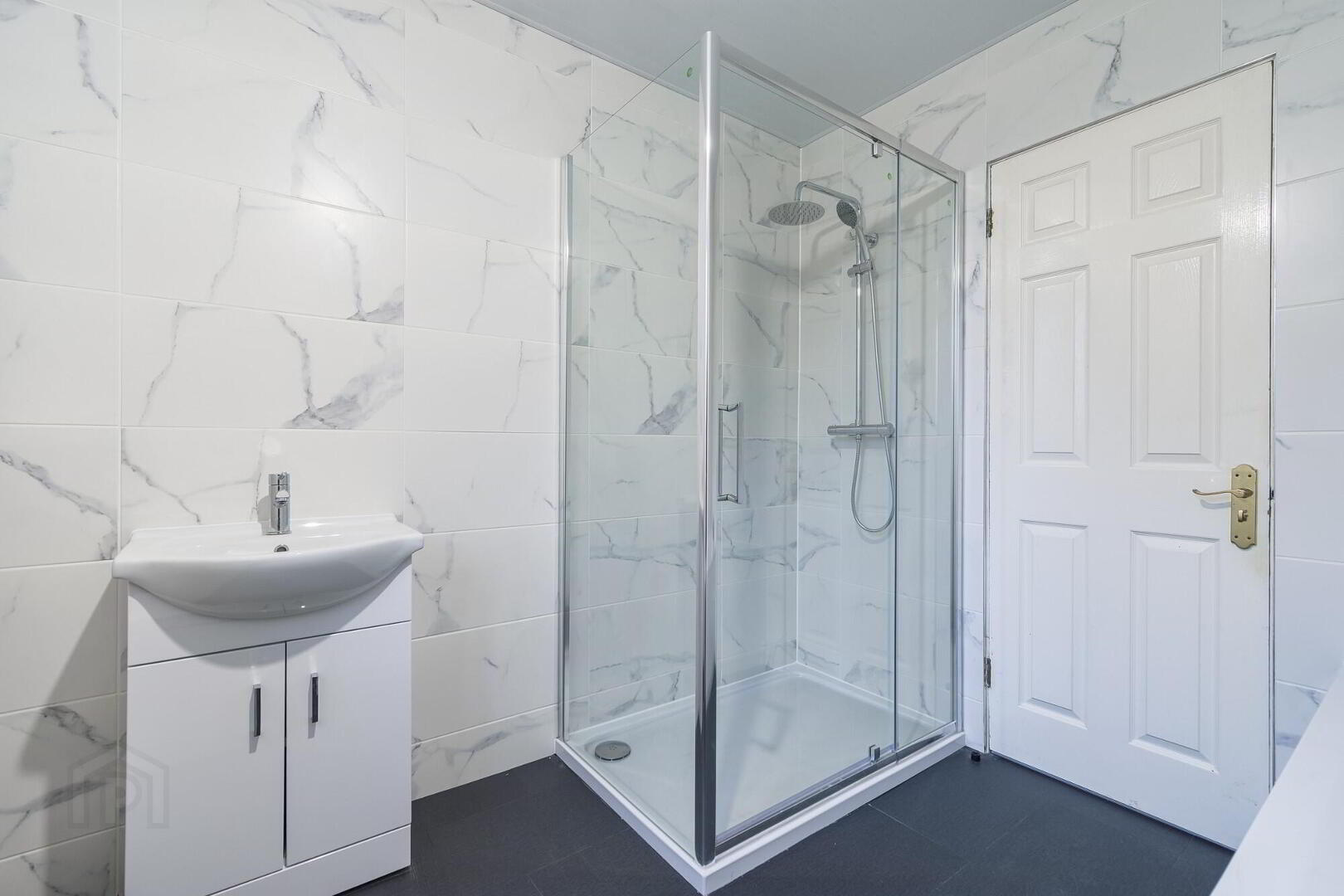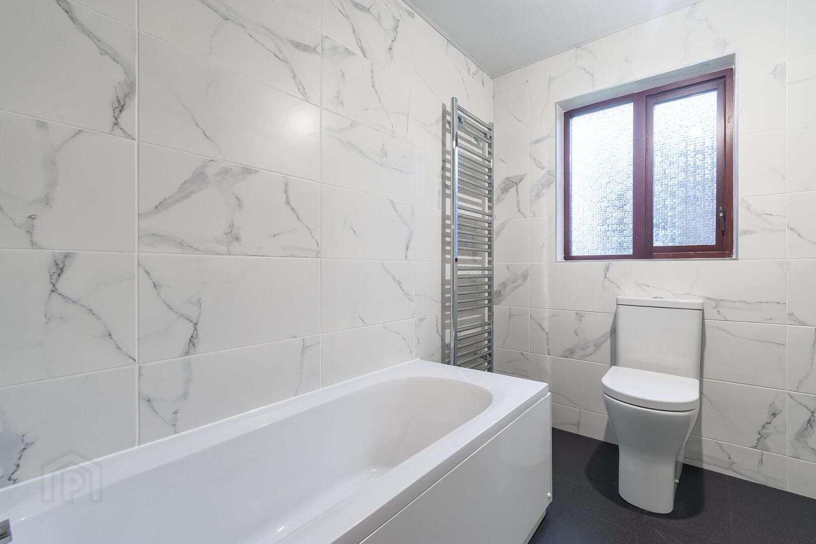 - Recently refitted contemporary white coloured bathroom suite comprising; low flush wc, wash hand basin with semi recessed vanity unit, inset bath and shower cubicle. Tiled walls and floor.