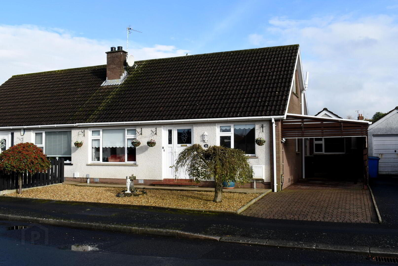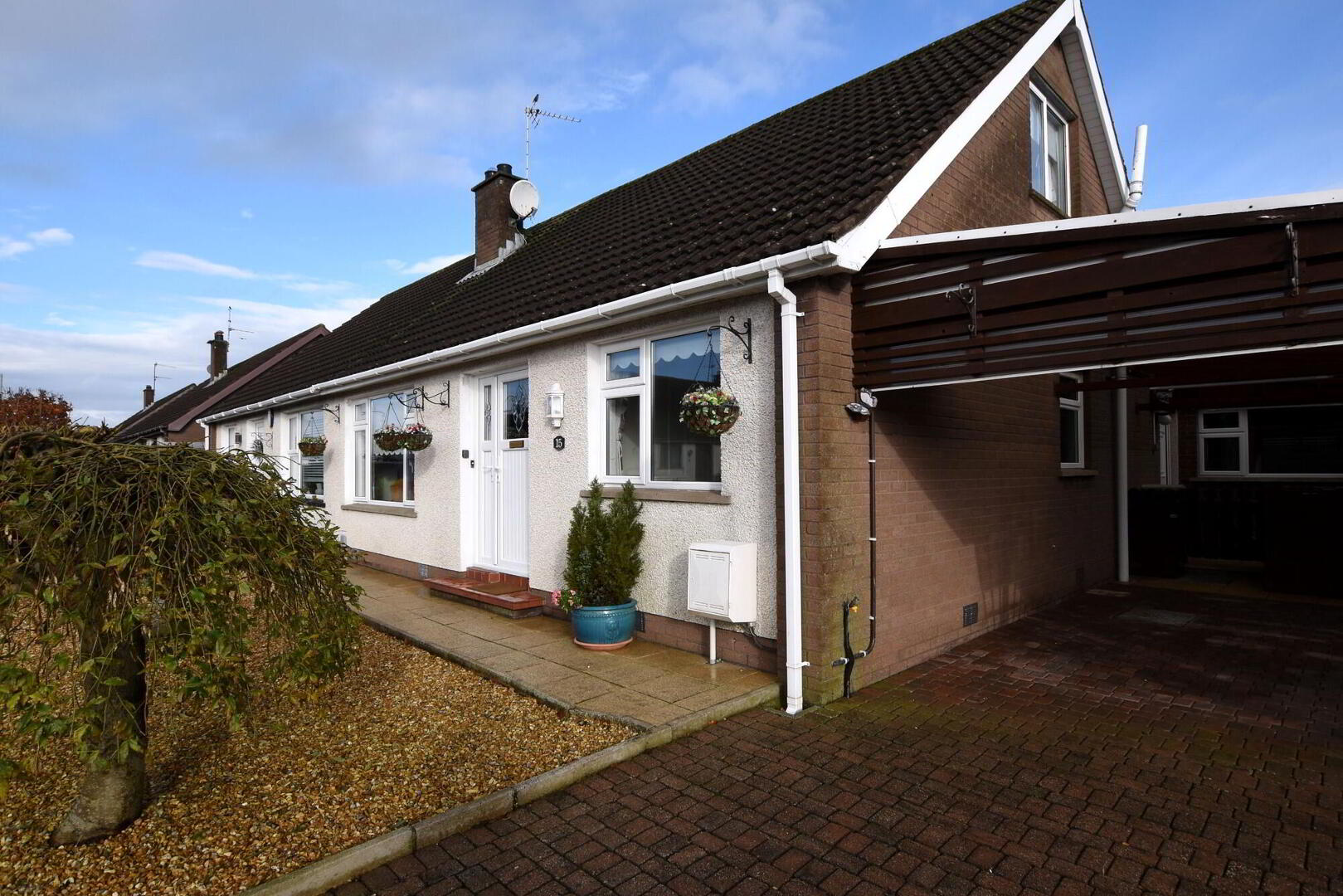 Extensive carport to side with concealed bin store, outside light.