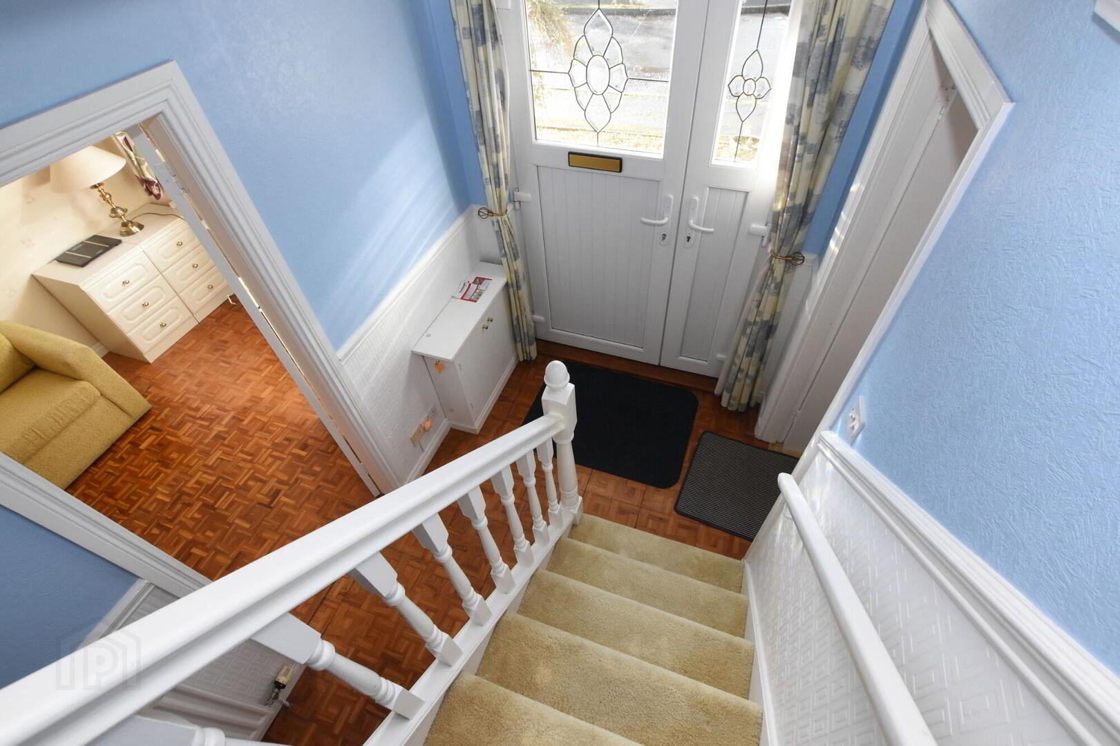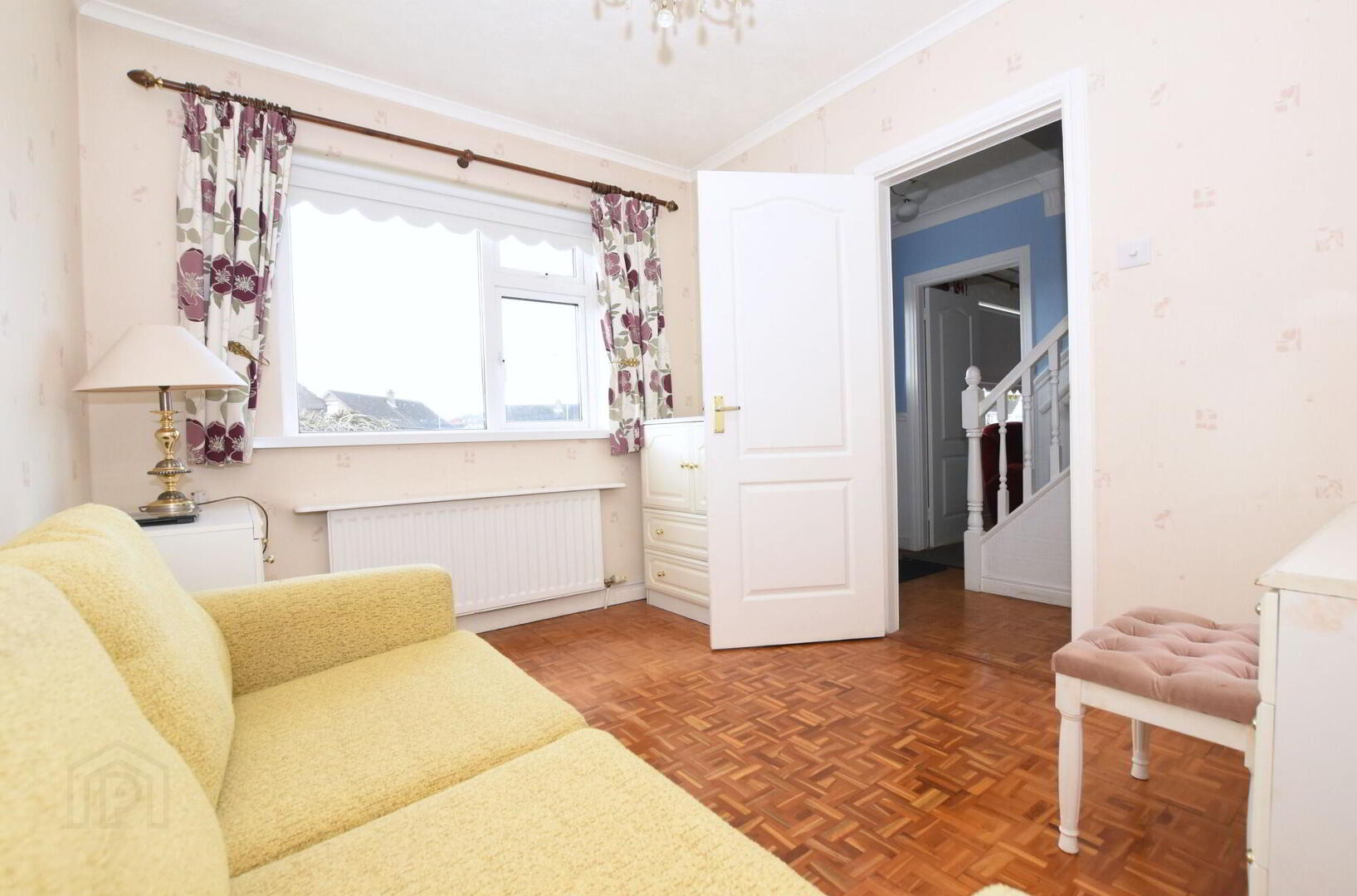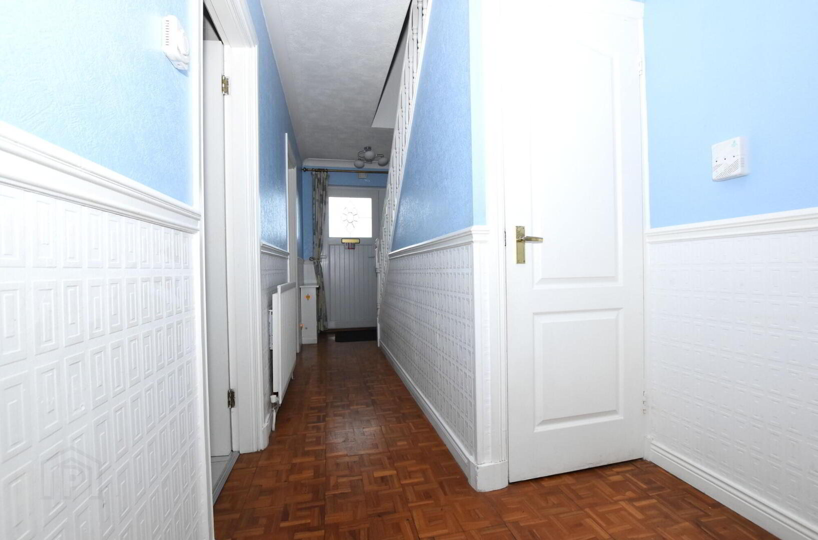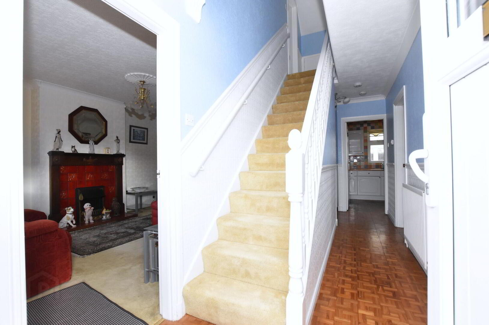 - uPVC double glazed extra wide front door, staircase to first floor, wooden parquet flooring, cornice to ceiling, understairs storage cupboard.