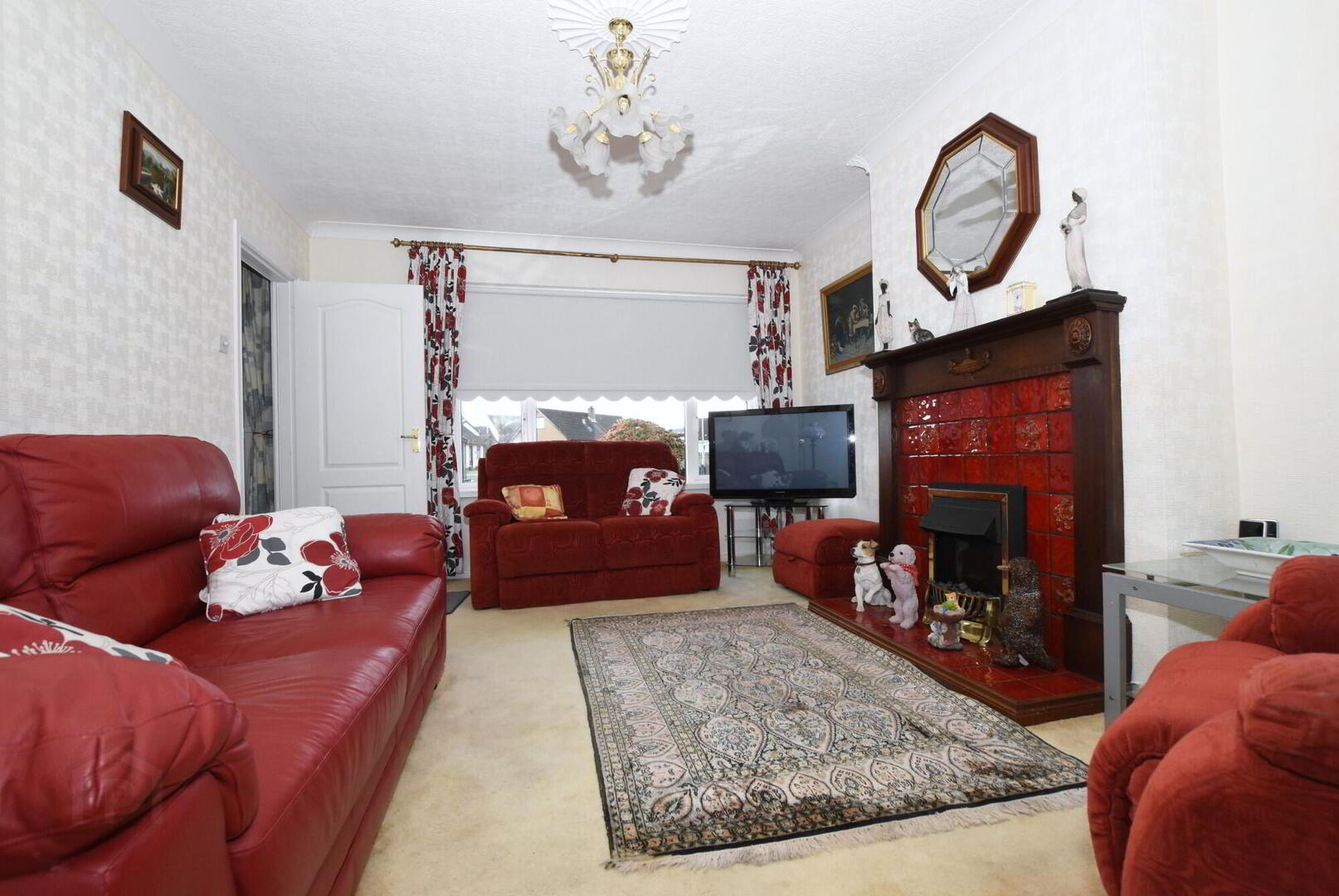 Feature fireplace with inset electric fire, coving to ceiling, archway to dining room. - Dining Room