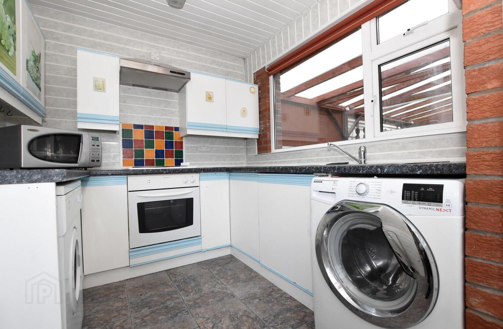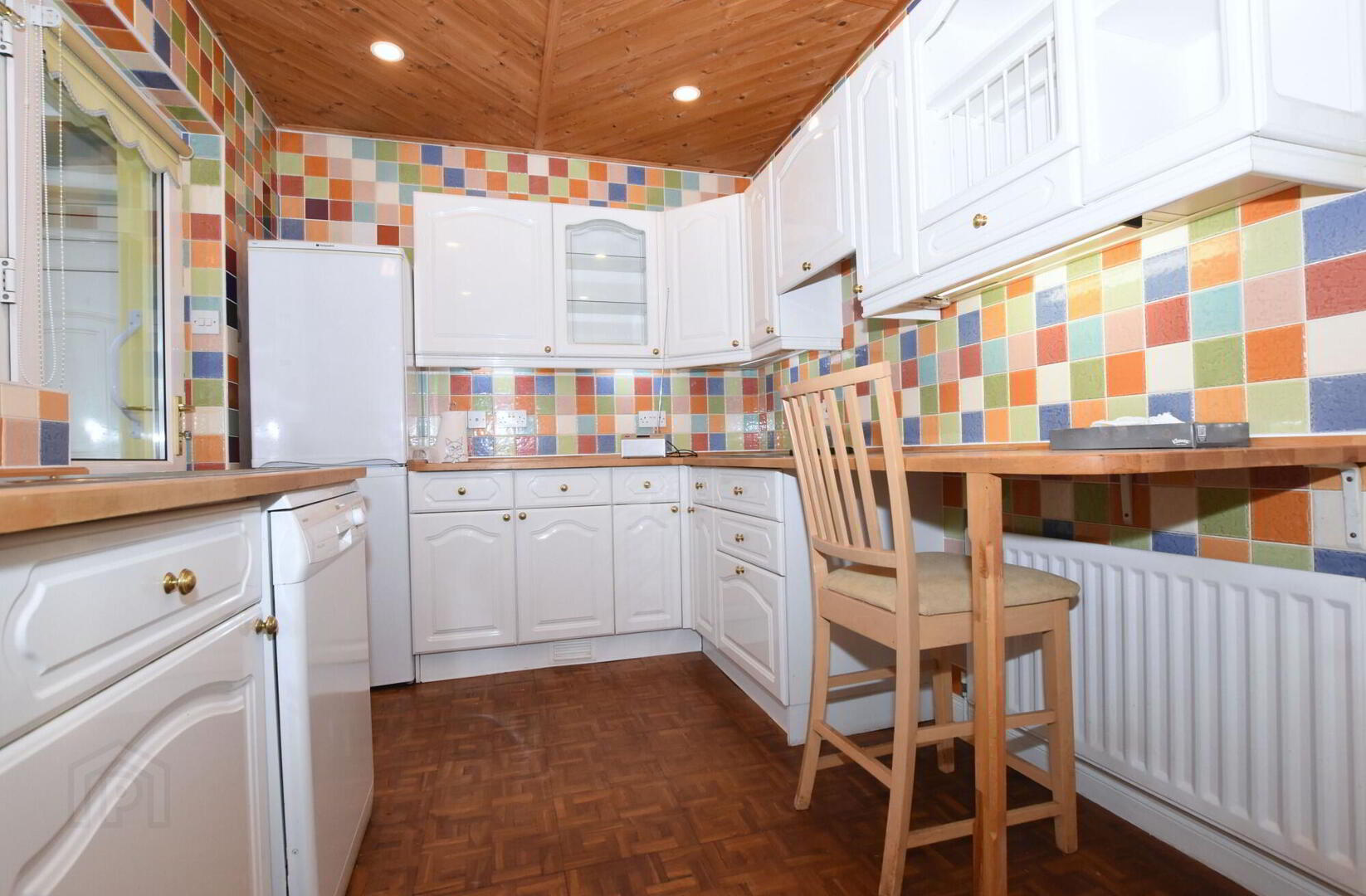 Good range of high and low level fitted kitchen units, fully tiled walls, 1 1/2 bowl stainless steel sink unit with mixer tap, plumbed for dishwasher, built in double oven, 4 ring electric hob, breakfast bar, wooden parquet flooring, wooden panel ceiling with low voltage downlights. - uPVC Double Glazed Conservatory