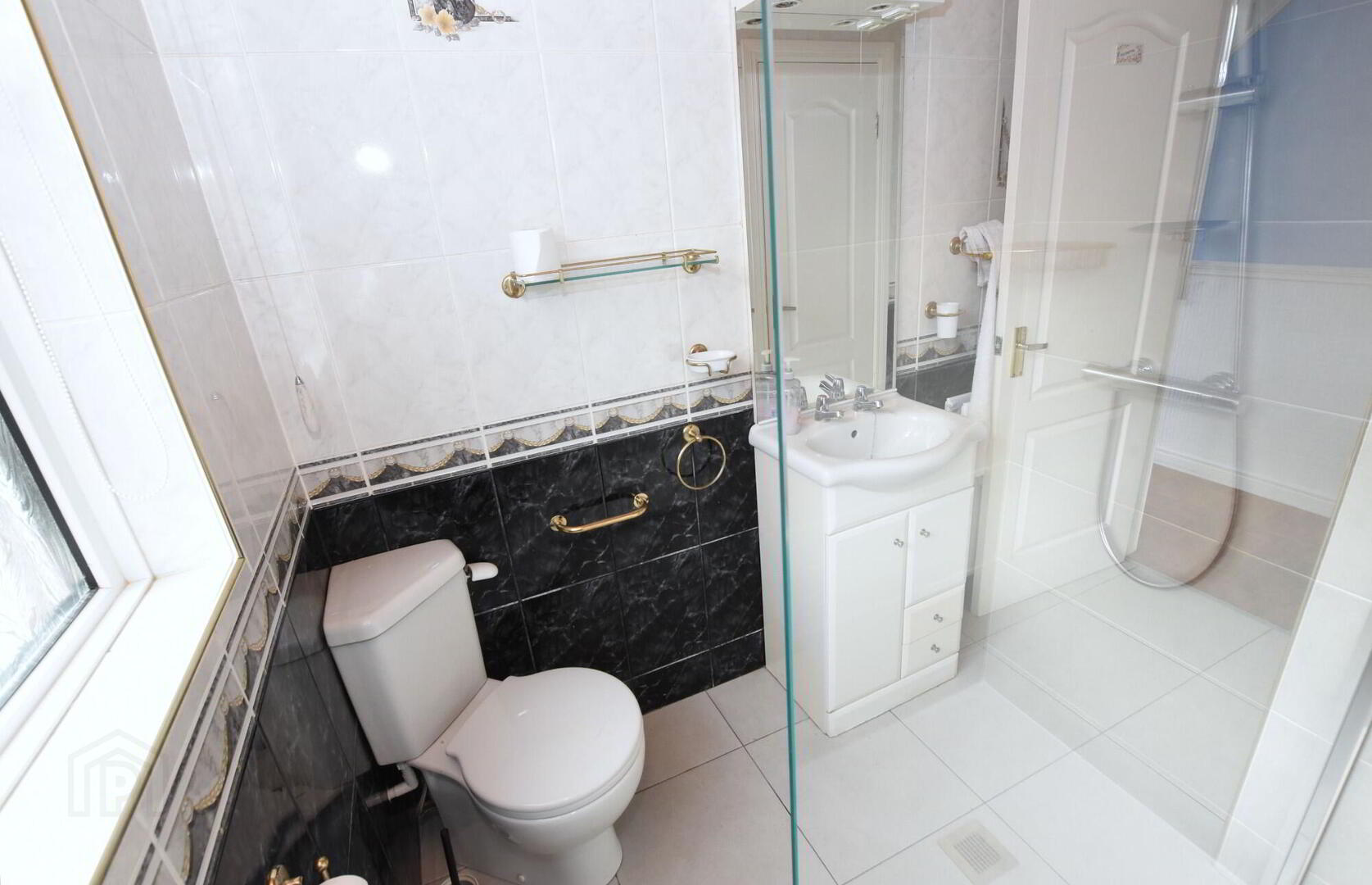 - Modern white coloured suite comprising: corner w.c., vanity unit with inset wash hand basin, large fully tiled glass shower enclosure, fully tiled walls, tiled floor, built in hot press, wooden panelled ceiling with low voltage downlights.