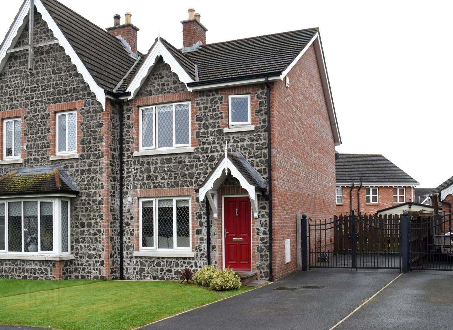 Garden in lawn to front and enclosed rear garden. Driveway to side with double wrought iron gates leading to secure carparking