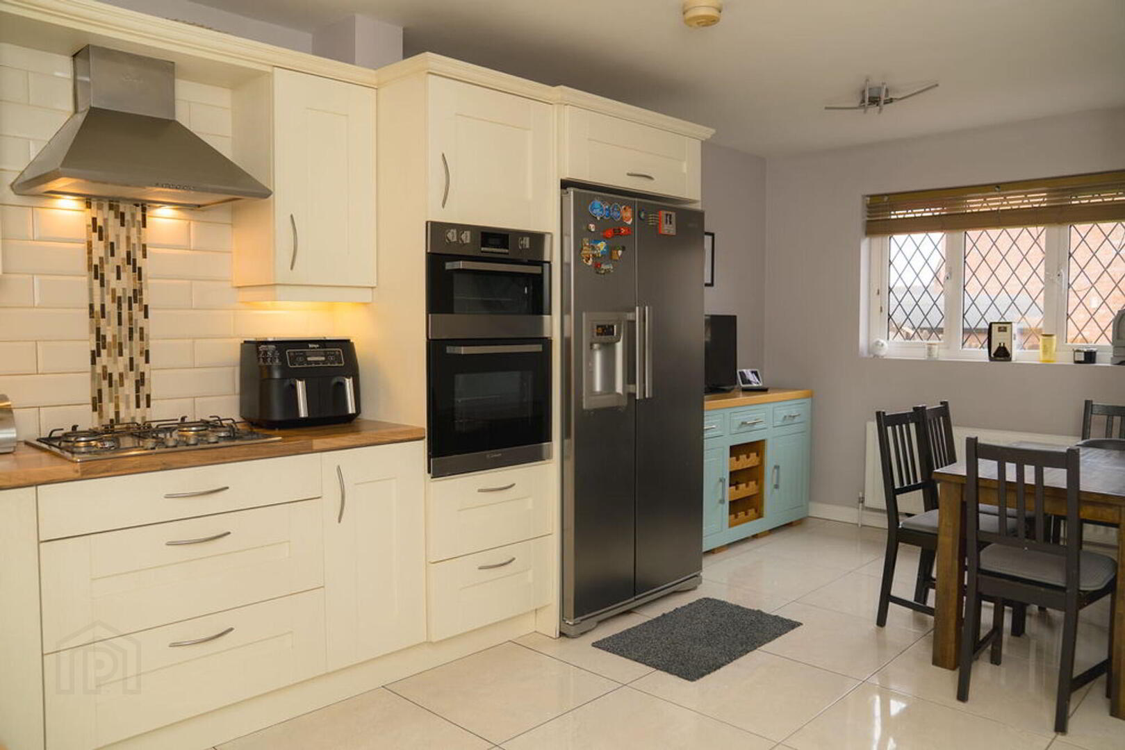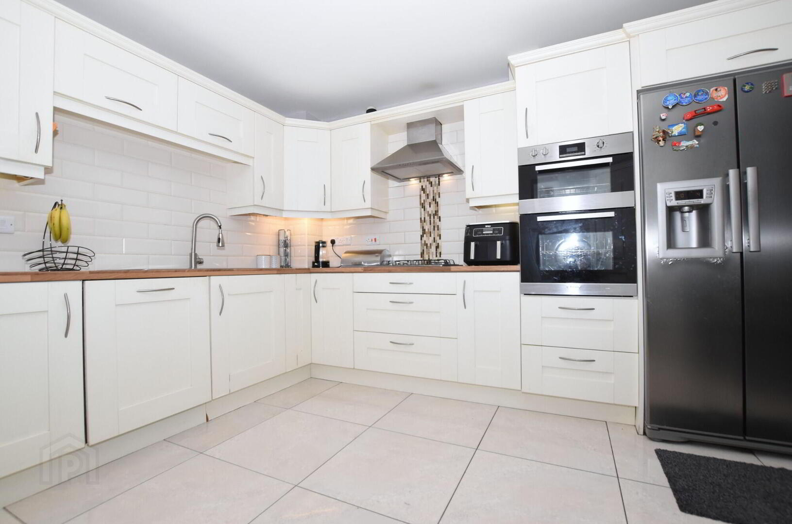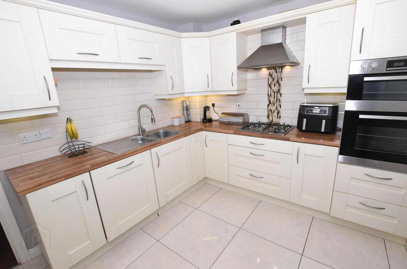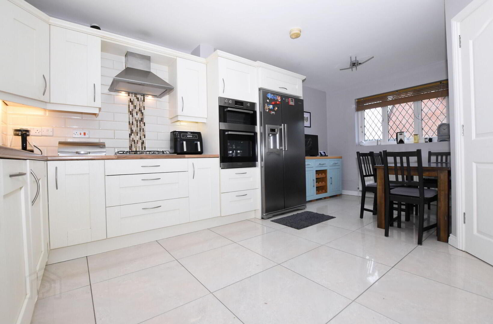 Excellent fitted kitchen with a good range of high and low level contemporary units. Part tiled walls. 11/2 bowl stainless steel sink unit with mixer taps. Integrated 4 ring gas hob, stainless steel extractor hood and built-in double oven. Integrated dishwasher. Space for an American style fridge/ freezer. Tiled floor. Large walk-in understairs storage cupboard.