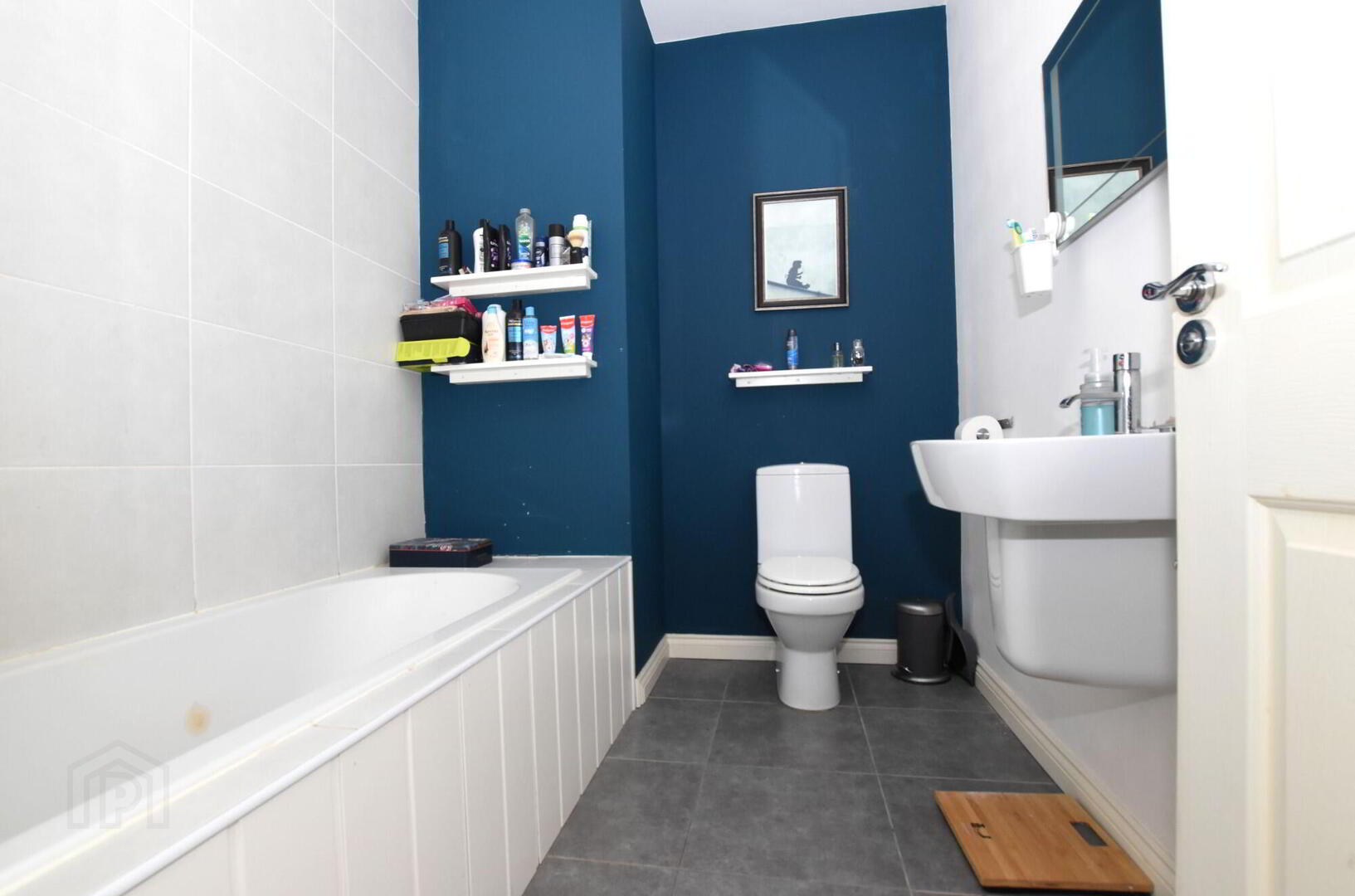 Modern white coloured sanitaryware comprising; panelled bath with shower over and glass shower screen, semi-pedestal wash hand basin and low flush wc. Part tiled walls. Tiled floor