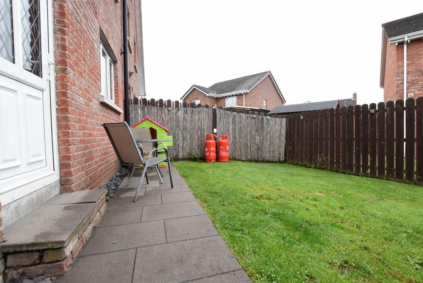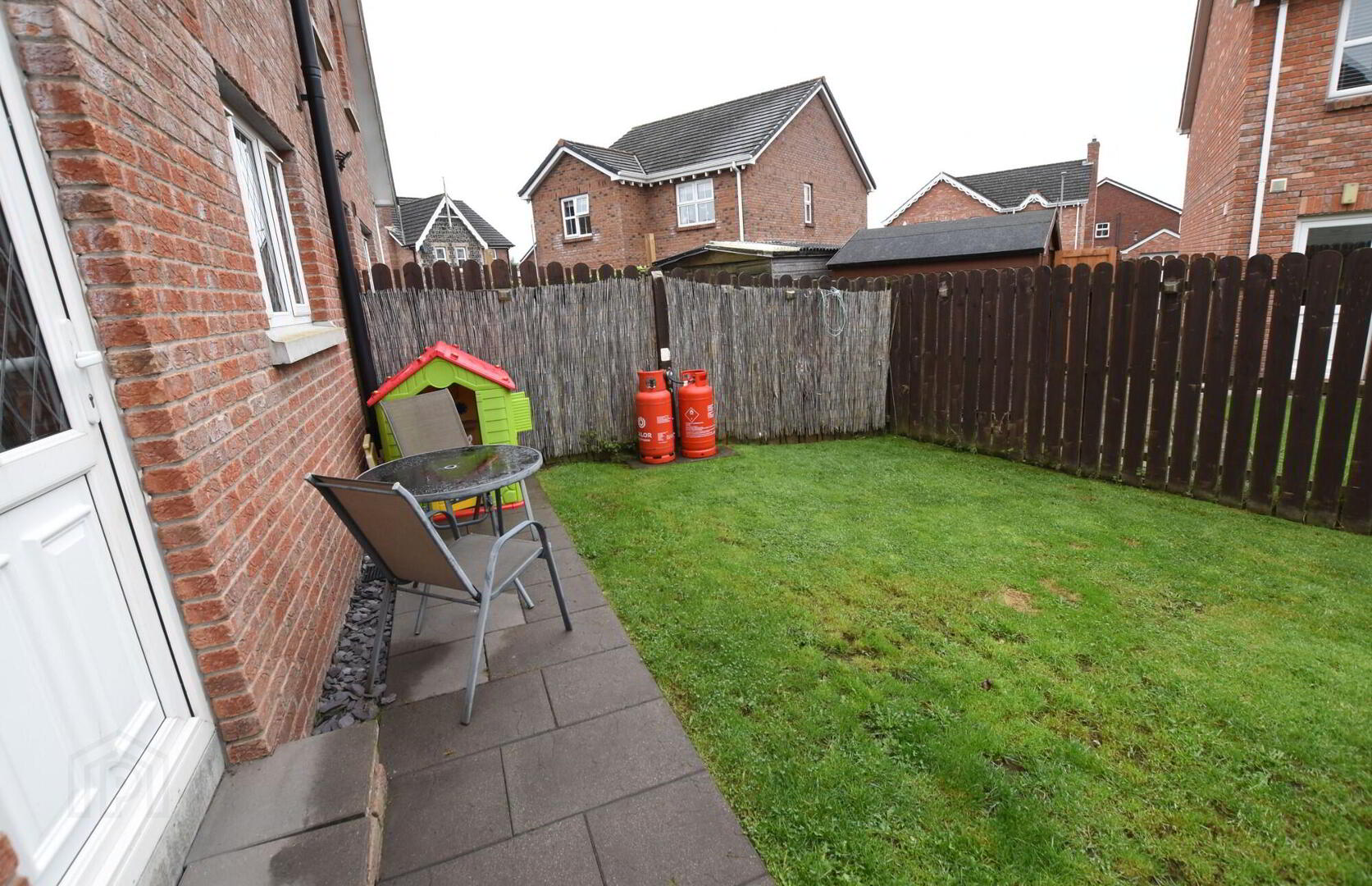Wooden fence and side gate leading to enclosed rear garden in lawn. Paved patio area.