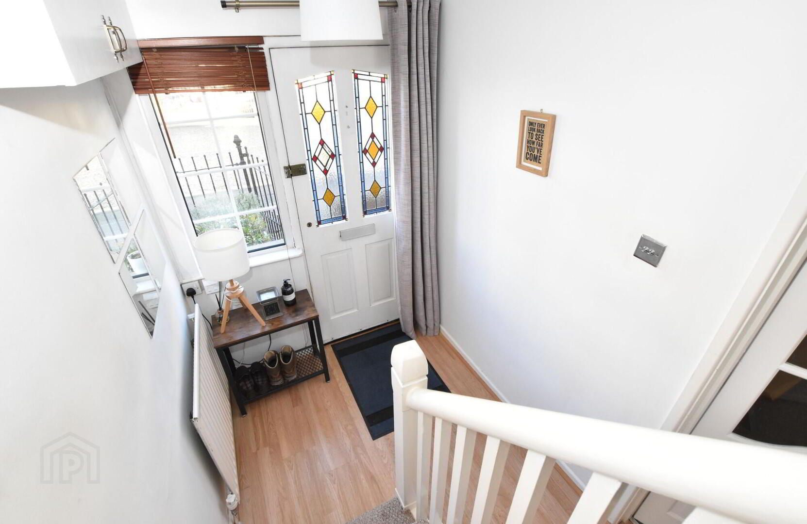 - Front door with feature stained glass panel. Spindled staircase to first floor. Understairs storage