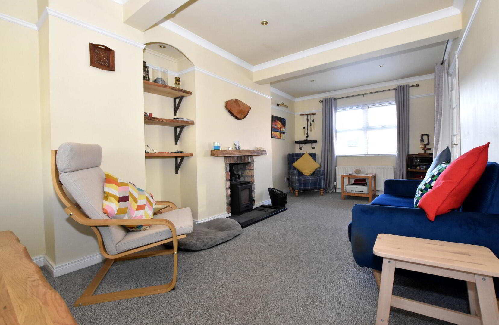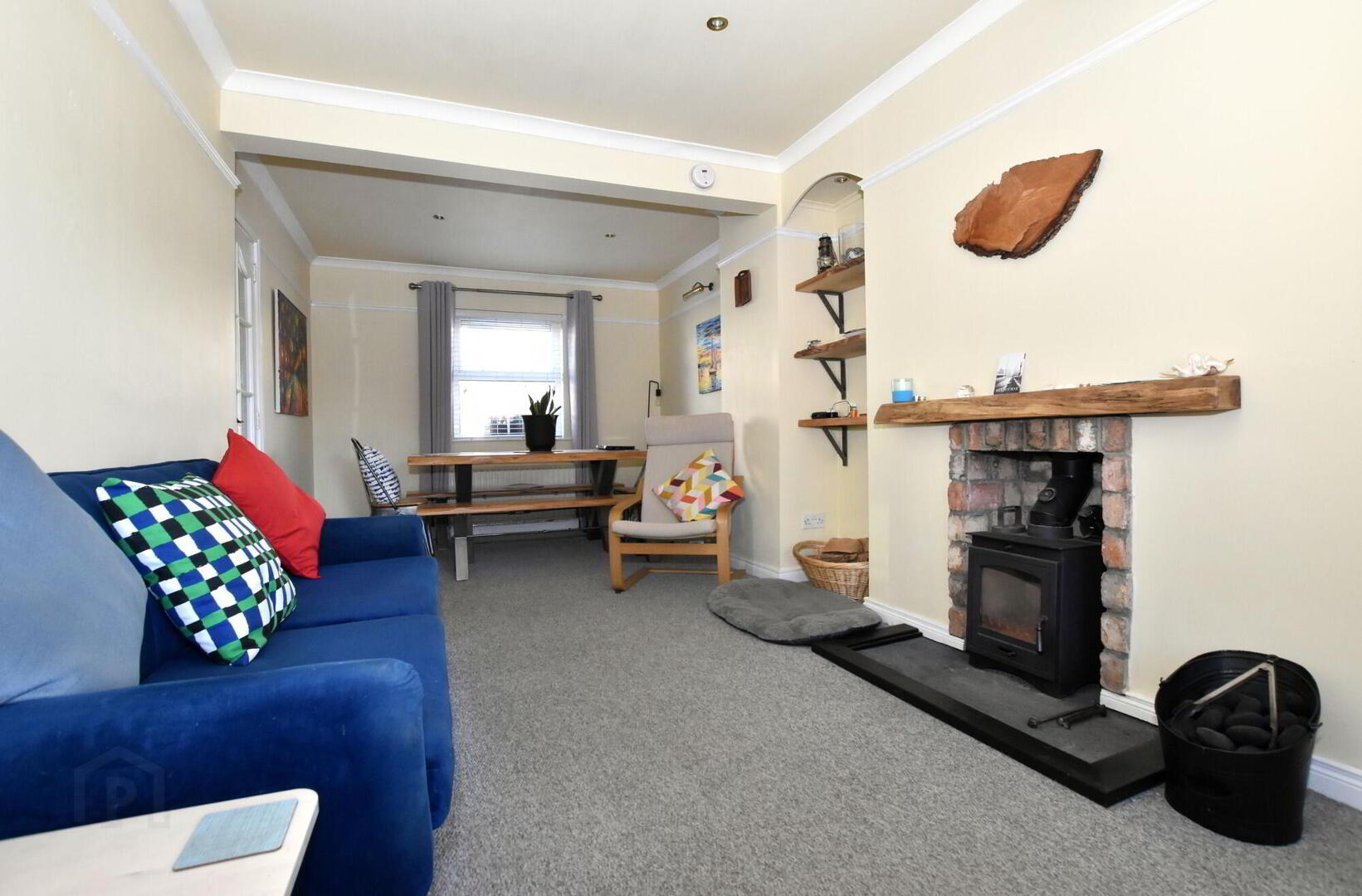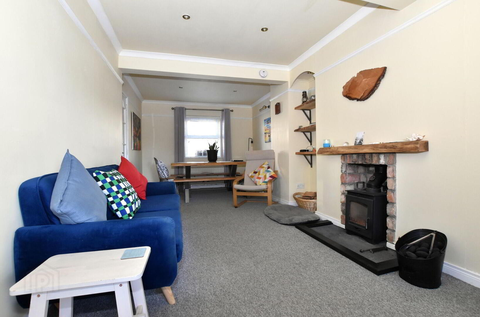 Glazed door from hallway. Antique brick fireplace with inset cast-iron wood-burning stove and stone hearth. Low voltage ceiling down lights. Coving to ceiling and Picture rail. Built-in shelving - Kitchen