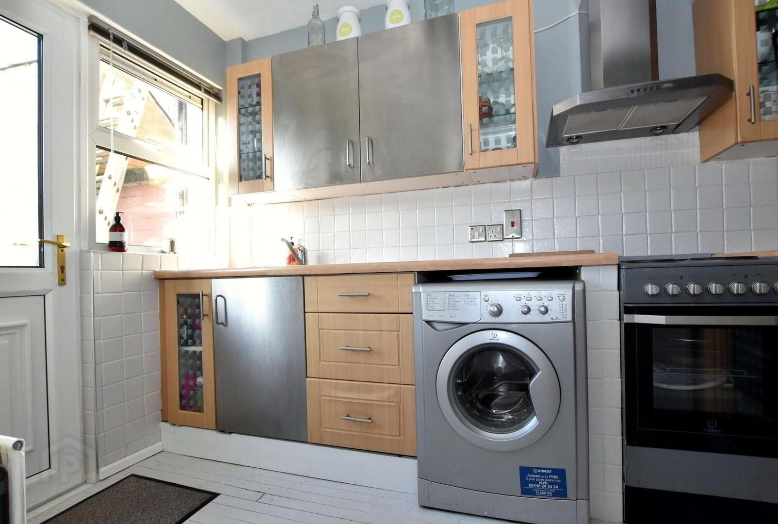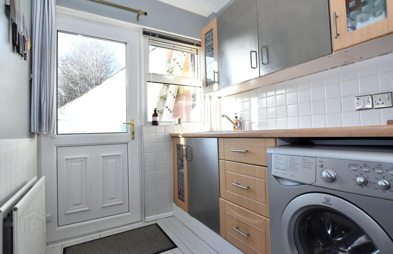 Good range of modern high and low level fitted kitchen units. Stainless steel extractor hood. Space for cooker. Plumbed for an automatic washing machine. Inset sink unit with mixer taps. Part tiled walls. Space for fridge/ freezer. Reclaimed wooden strip flooring. uPVC double glazed exterior door.