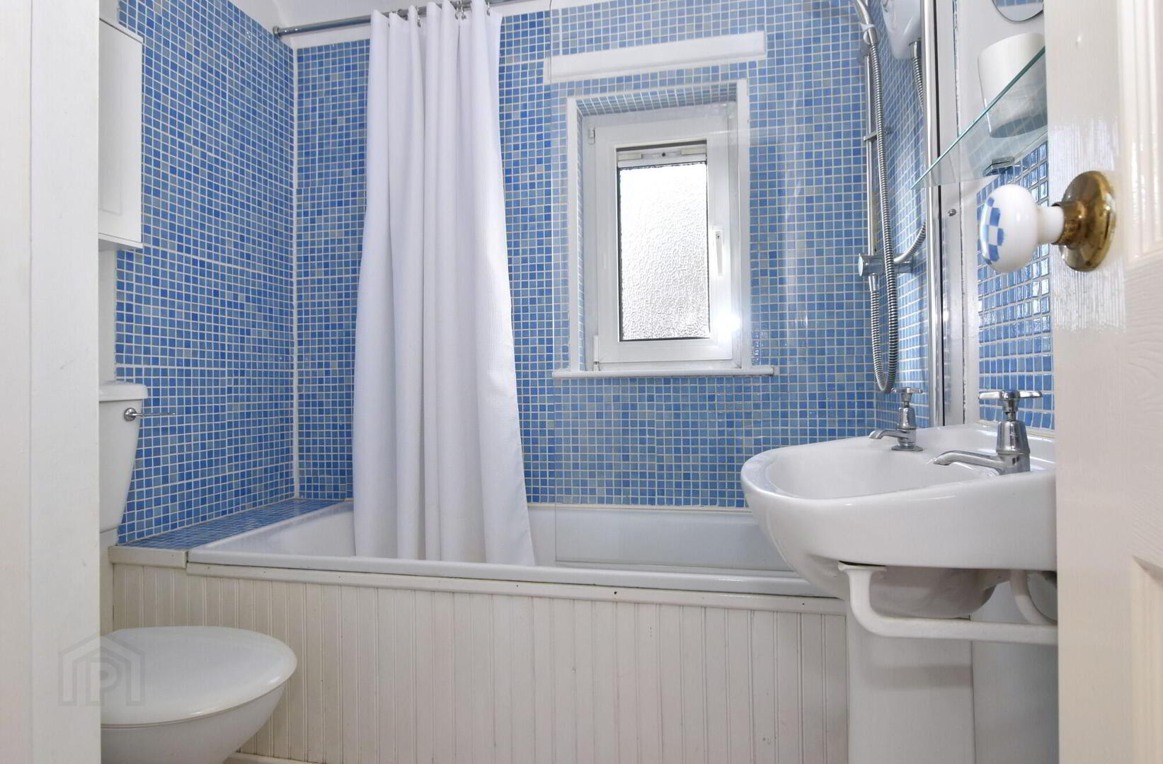 - Modern white suite comprising panelled bath, wc with glass shower screen and electric shower over the bath, and wash hand basin and low flush wc. . Partially tiled walls with Mosaic tiles. Built-in hotpress. Wooden laminate. Extractor fan.