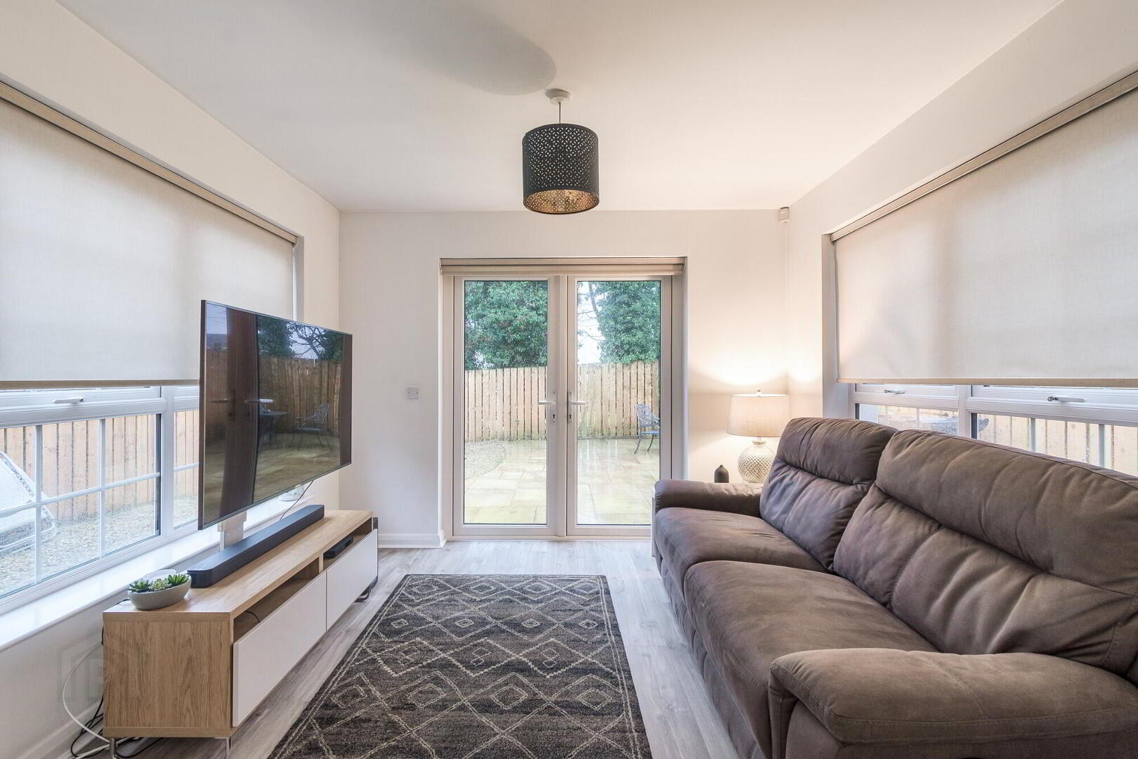 Wooden laminate flooring. Double patio doors to garden.