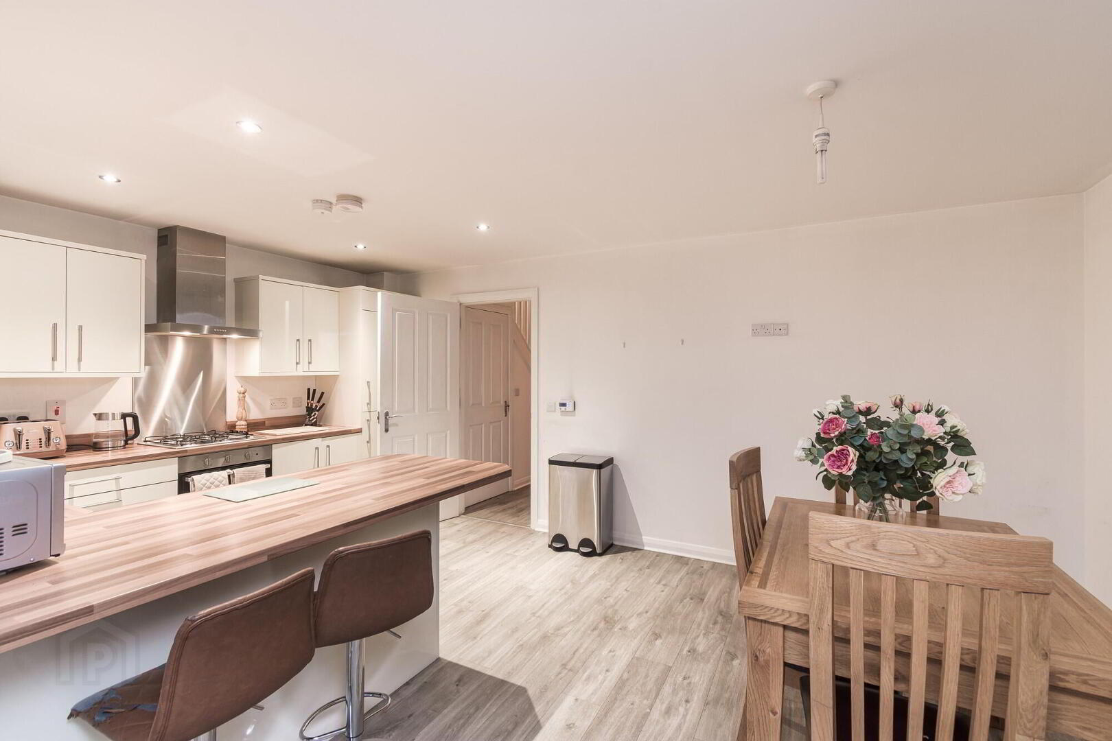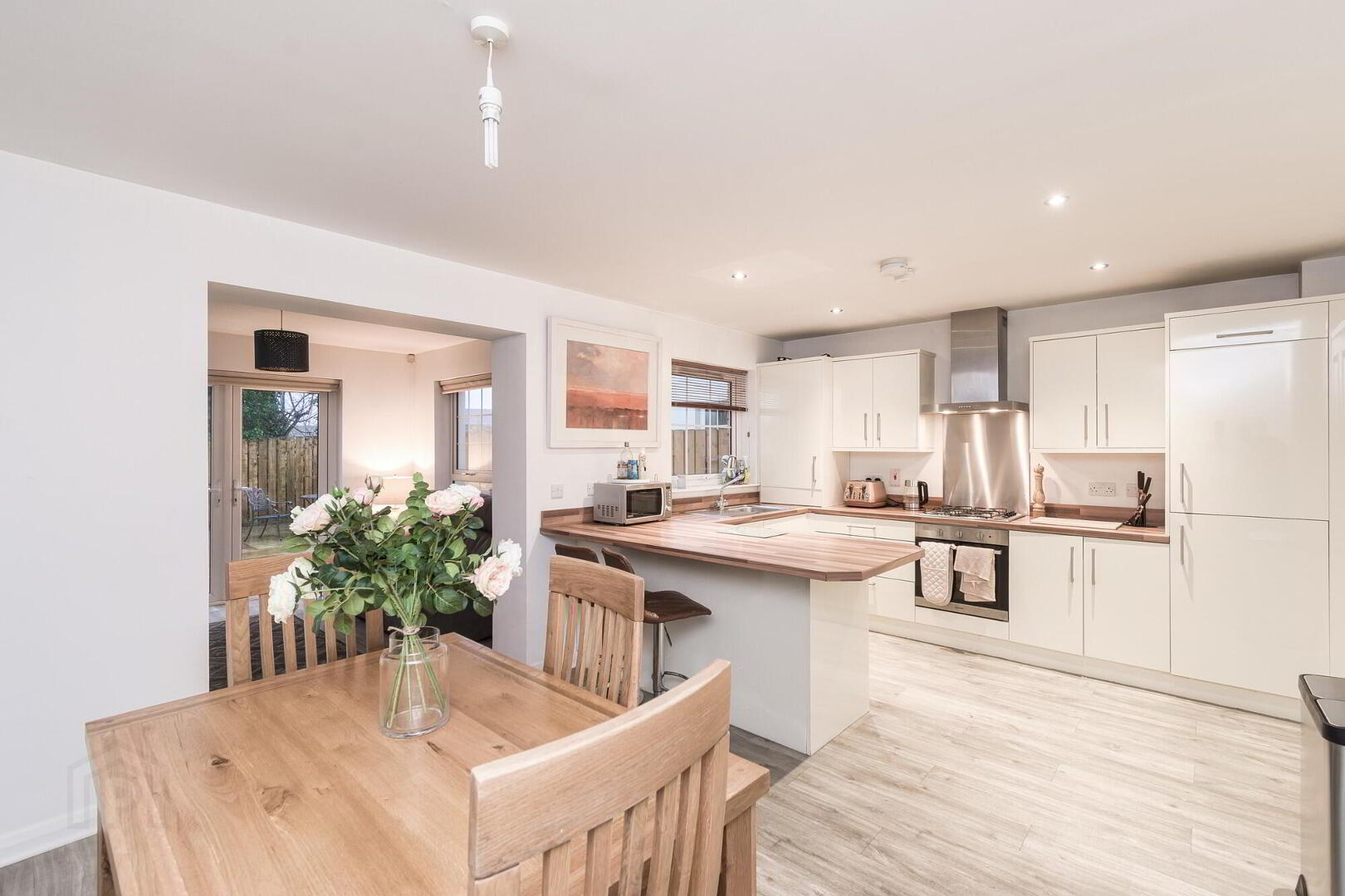Contemporary white gloss fitted kitchen with excellent range of high and low level units. Stainless steel splashback. 4 ring gas hob. Stainless steel sink unit with mixer tap. Built in under oven. Plumbed for automatic washing machine. Integrated dishwasher. Integrated fridge freezer. Breakfast bar. Low voltage down lights. Wooden laminate flooring. Archway to sunroom.