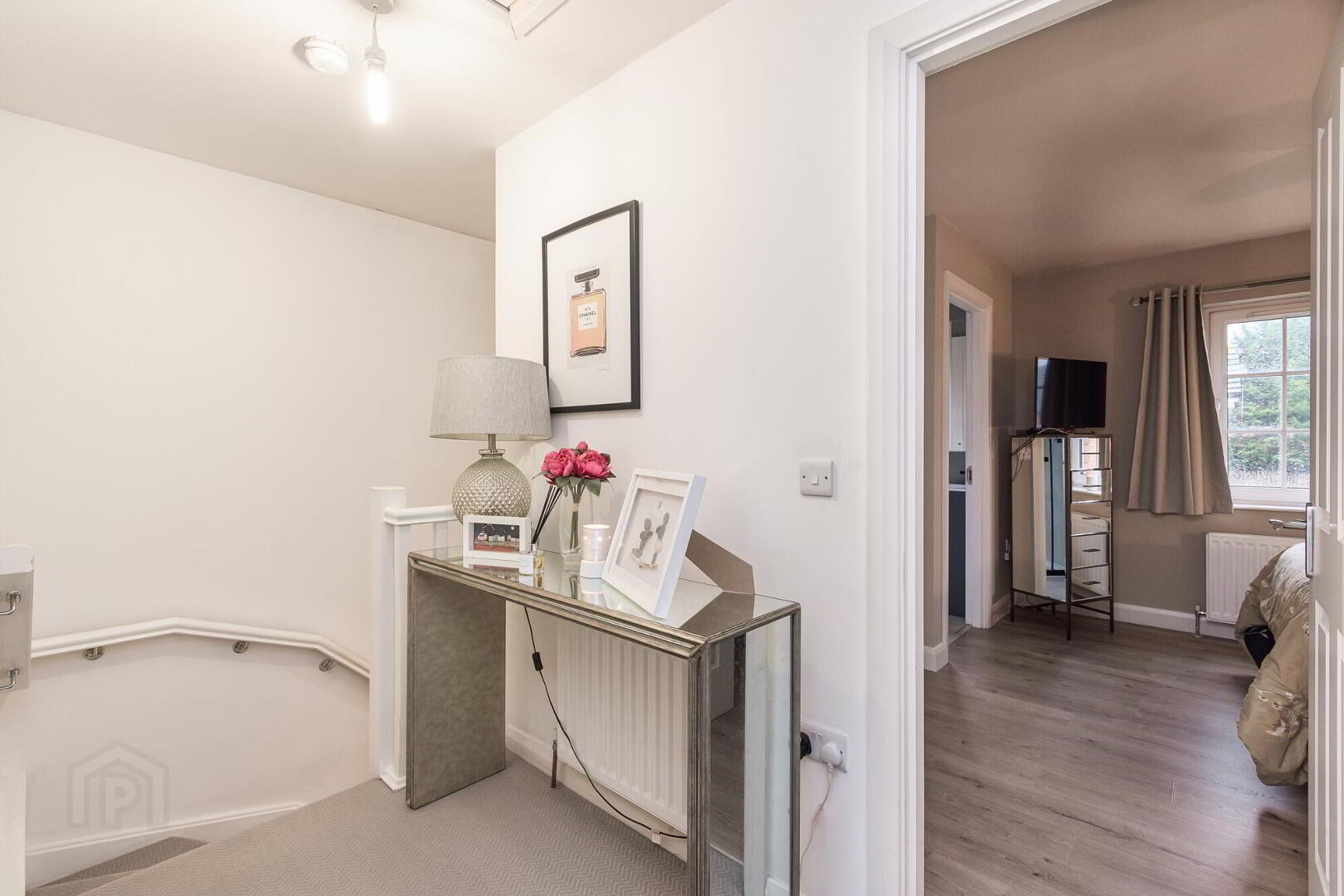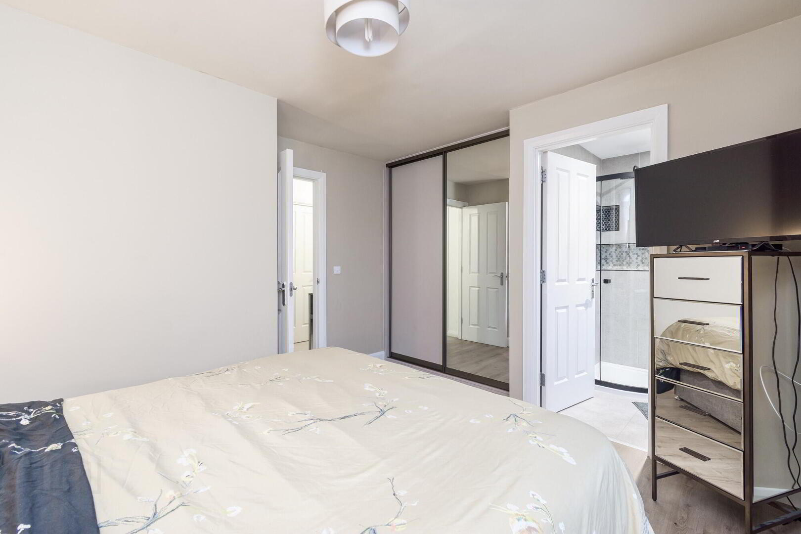 Feature panelled wall. Wooden laminate flooring. Built in mirrored wardrobes.