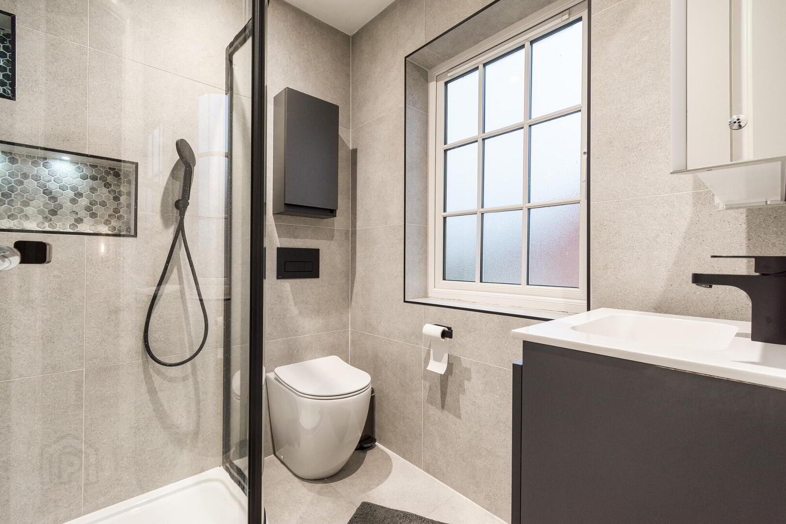 Contemporary suite comprising low flush wc. Fully tiled shower enclosure with contemporary black coloured drench shower and handheld shower. Vanity unit with inset wash hand basin. Fully tiled walls. Tiled floor. Black coloured heated towel rail. Low voltage down lights.