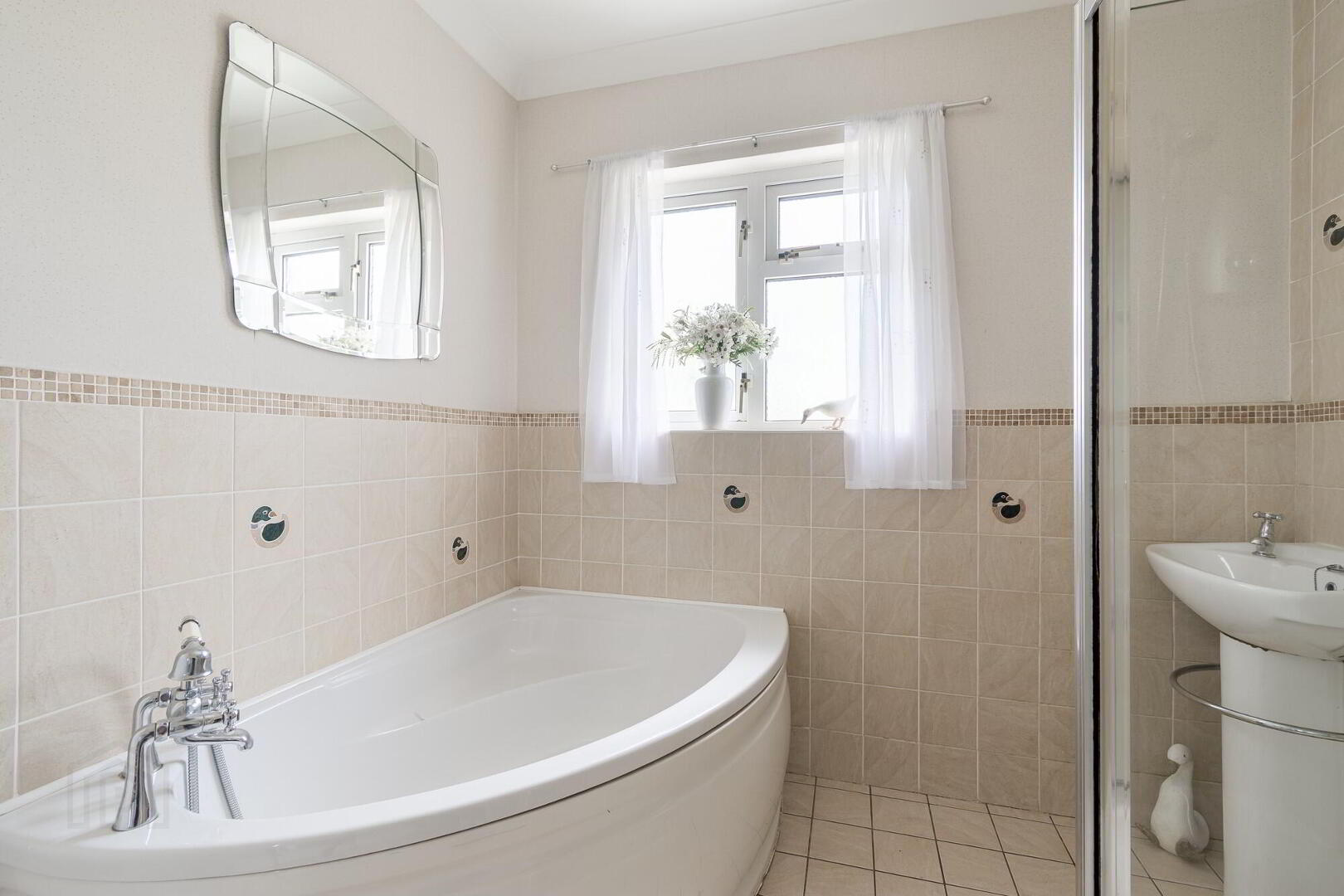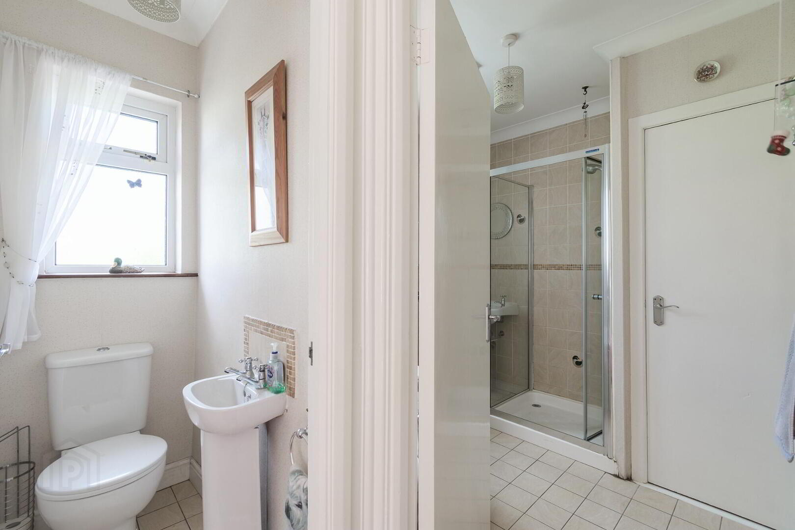 - Modern white coloured suite comprising; corner bath with chrome mixer taps and shower attachment, pedestal wash hand basin and fully tiled shower enclosure with folding doors. Built-in hotpress. Tiled floor. Half tiled walls. Coving to ceiling. SEPARATE WC.