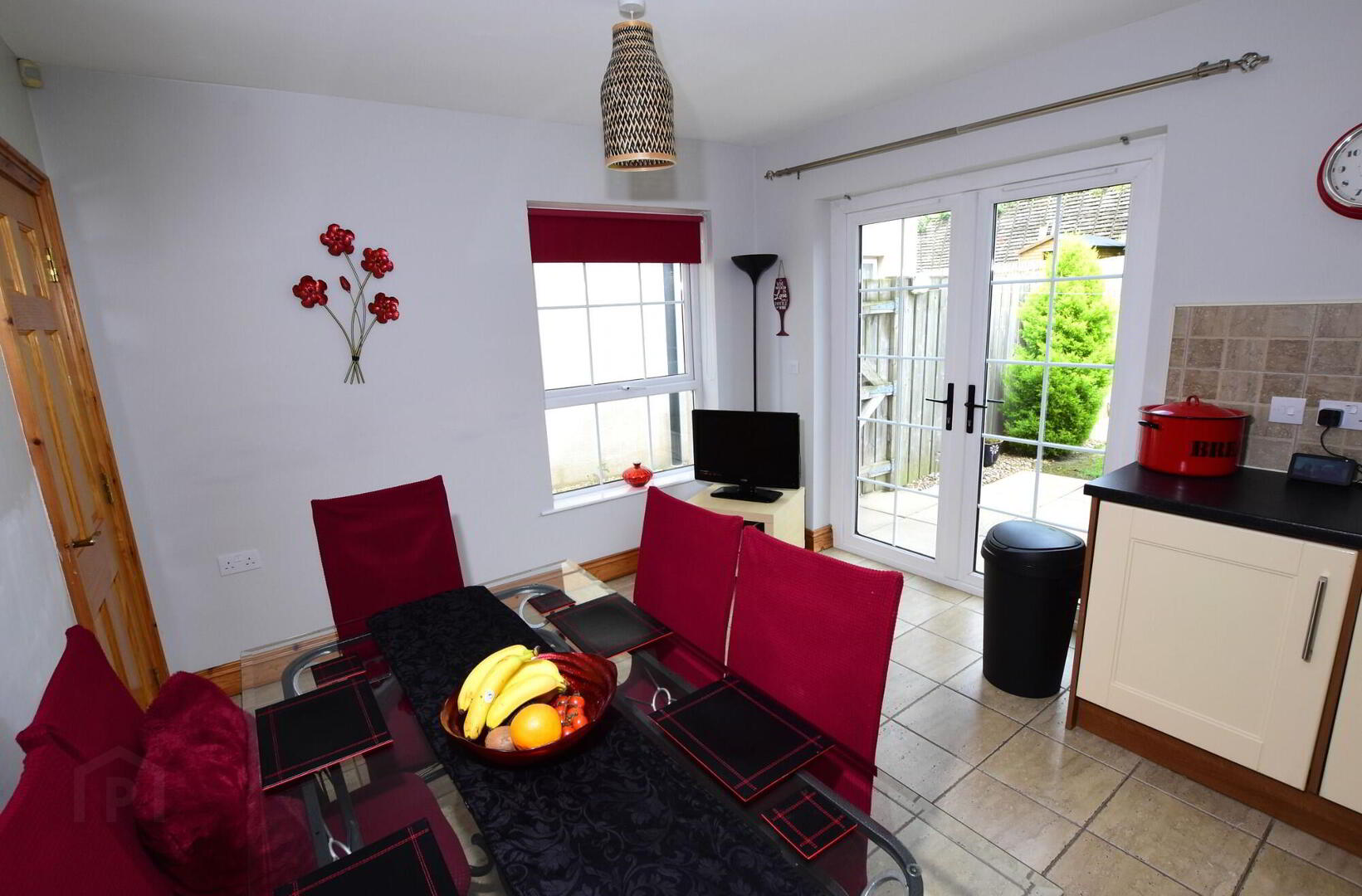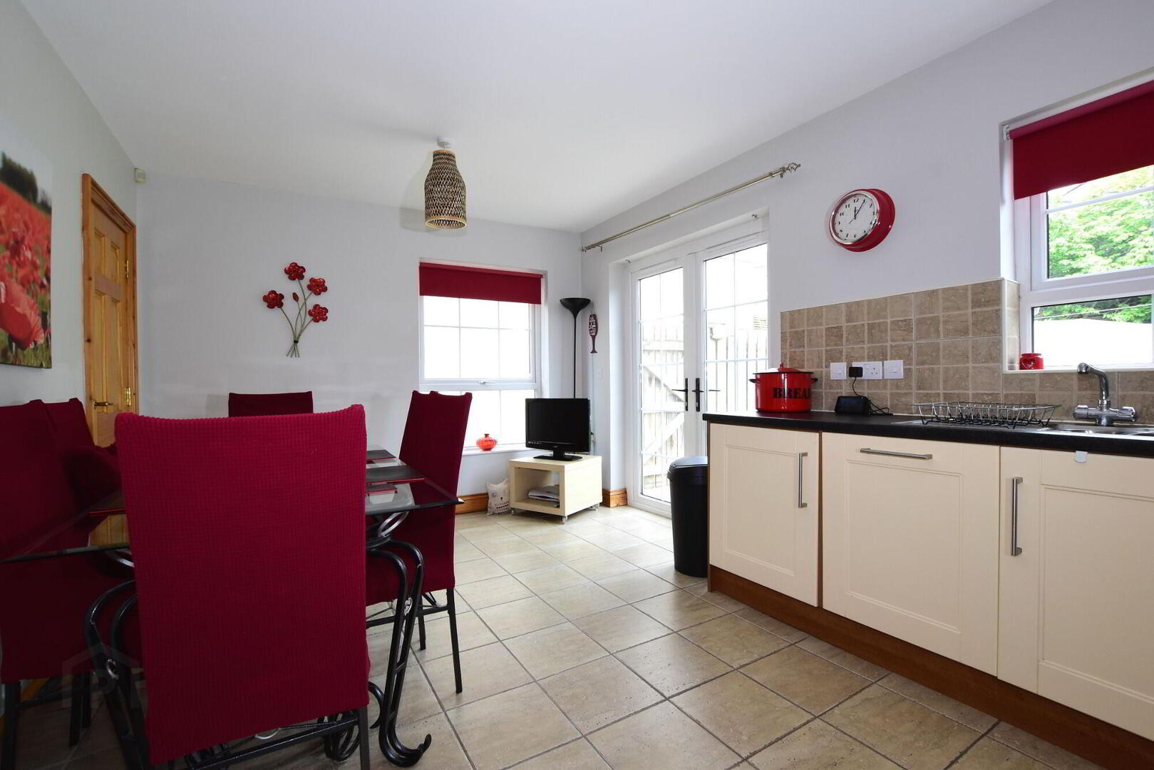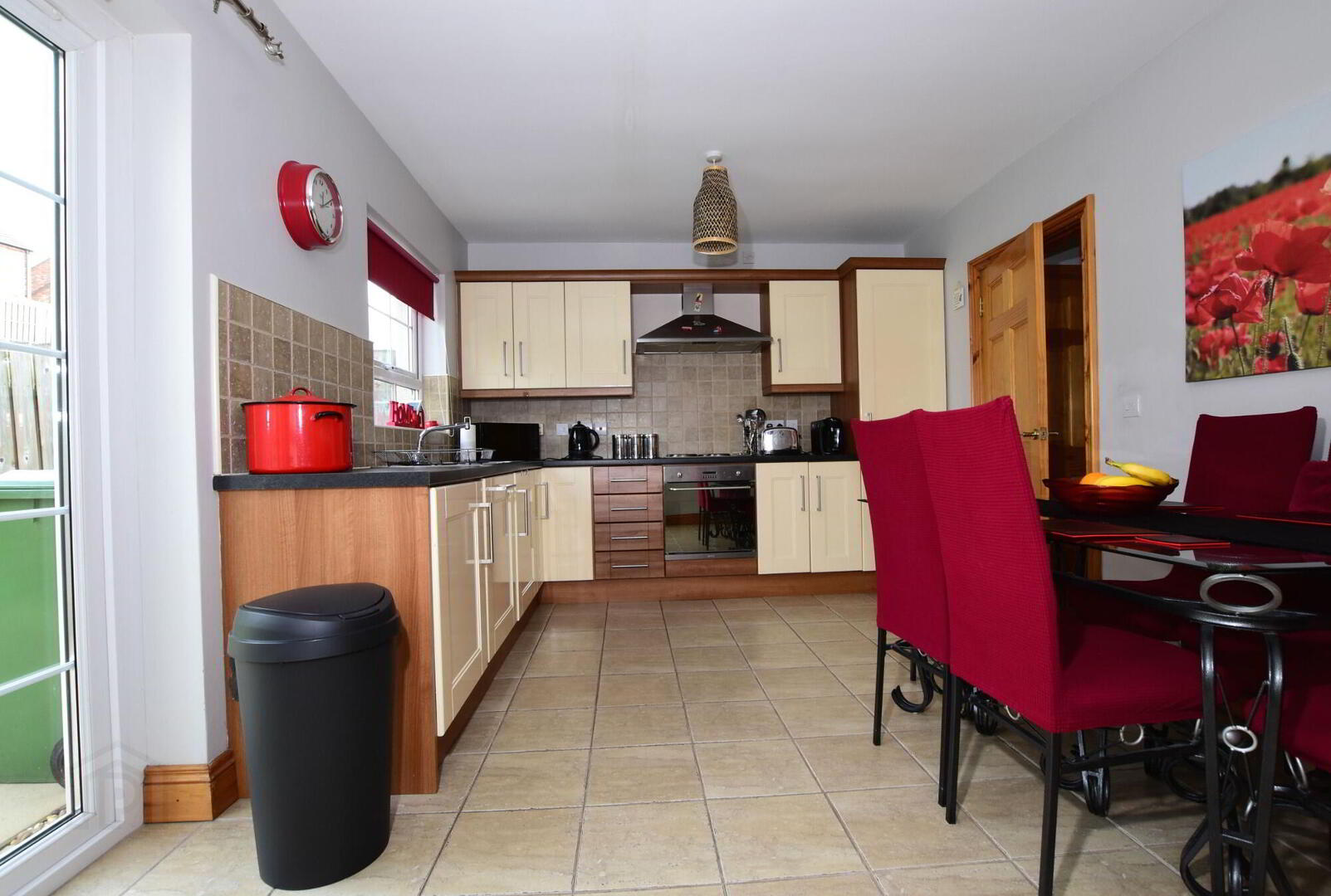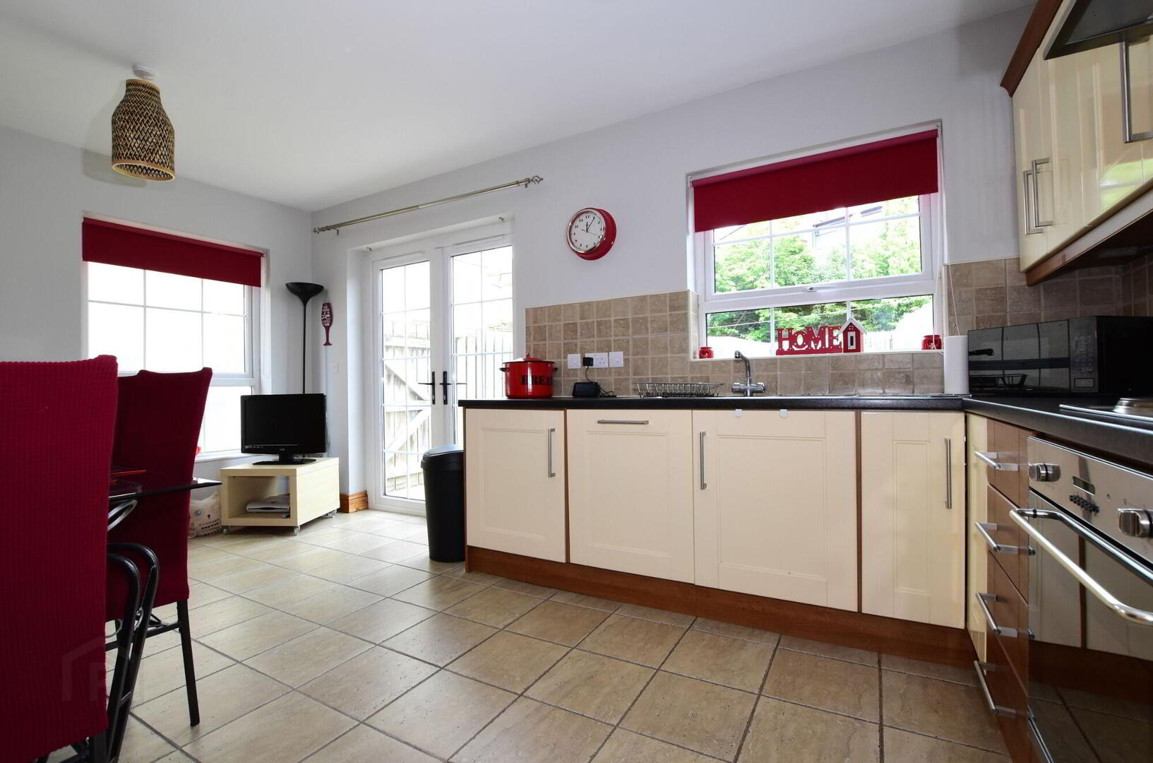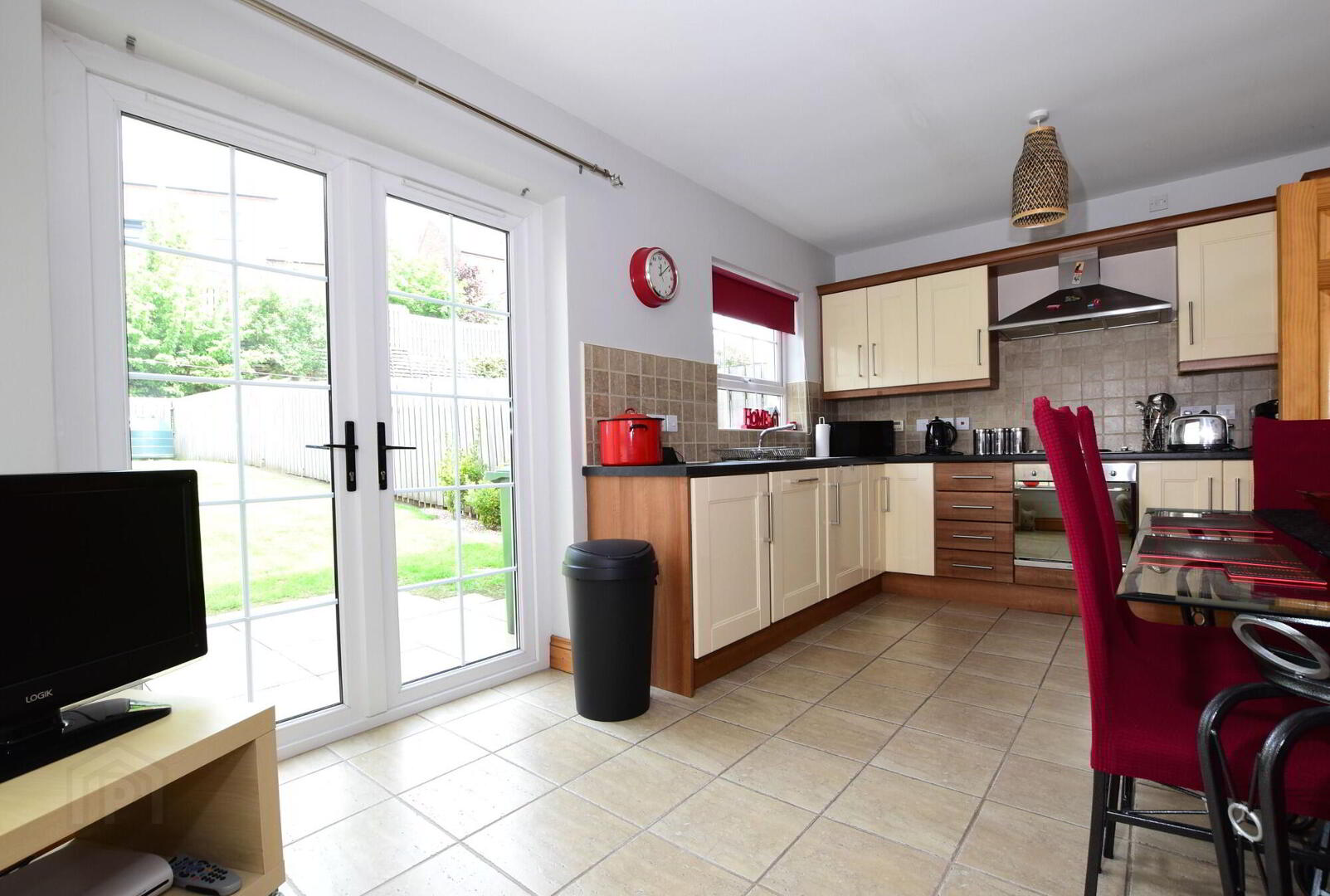 Excellent range of high and low fitted units. Stainless steel extractor hood, integrated electric hob and built-in stainless steel oven. Integrated fridge/ freezer. Integrated dishwasher. Plumbed for automatic washing machine. Stainless steel sink unit with mixer taps. Part tiled walls. Tiled floor. Large built-in storage cupboard. uPVC double glazed patio doors to garden.