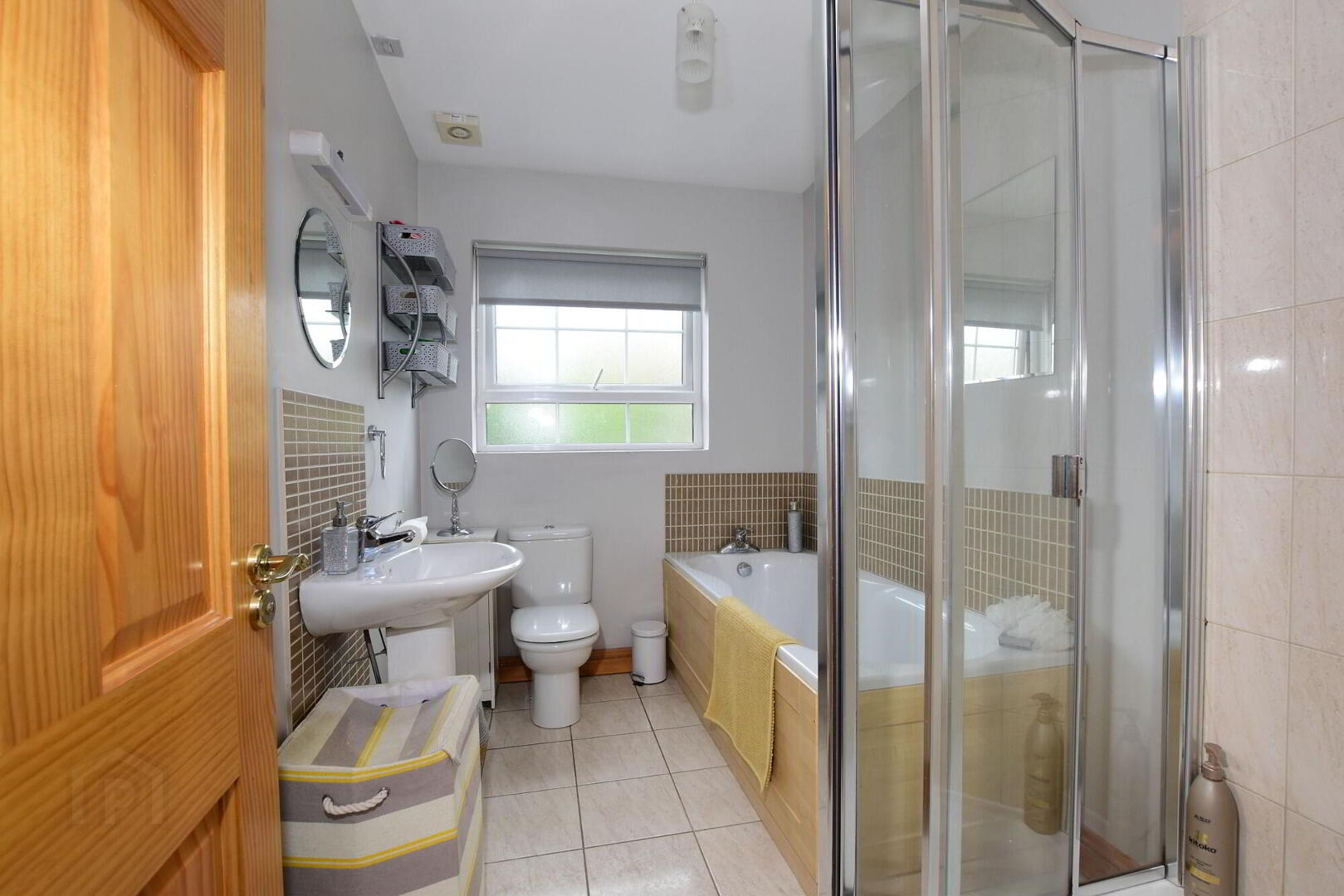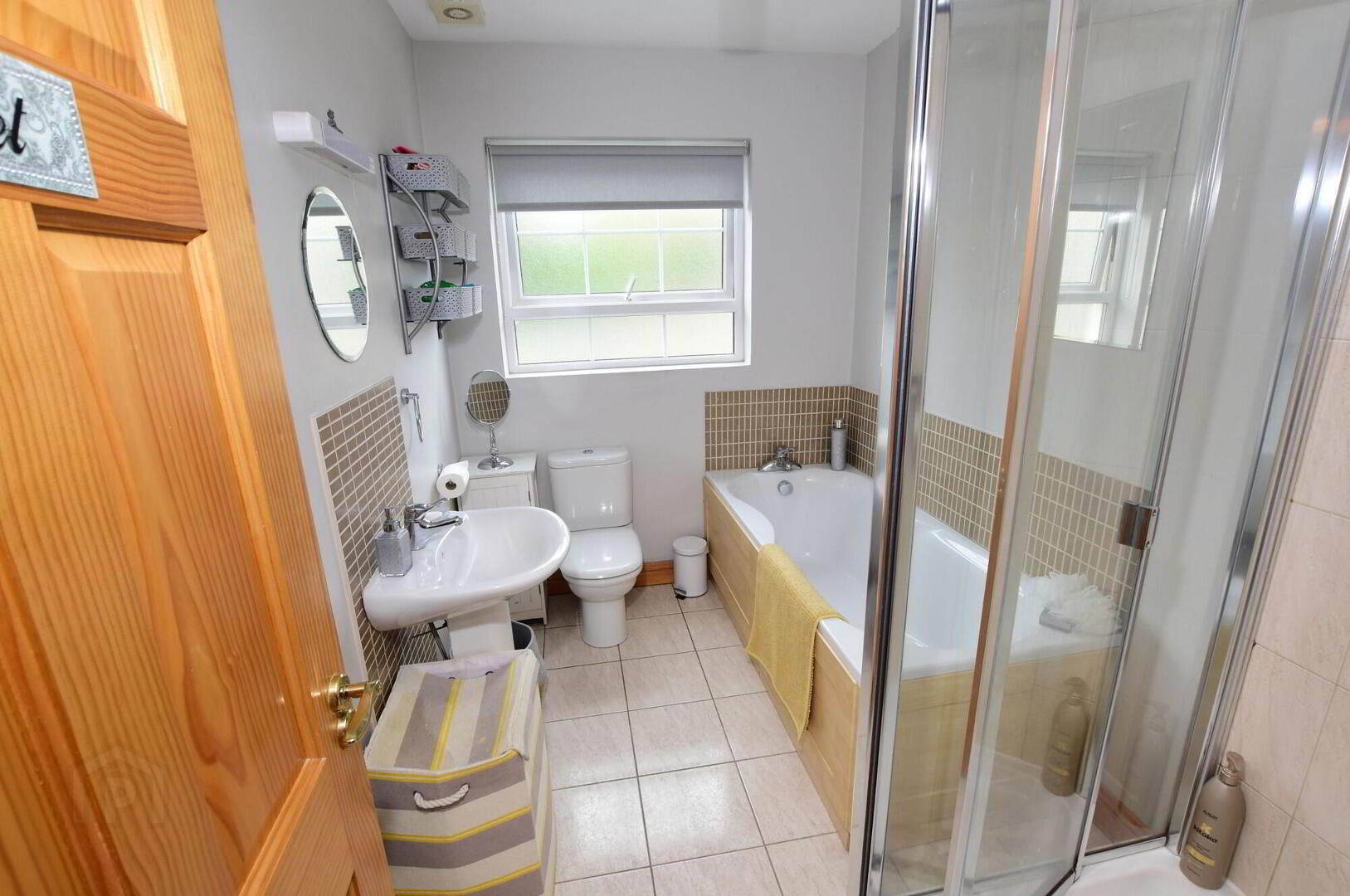 White coloured suite comprising; panelled bath with mixer taps, low flush wc, pedestal wash hand basin and fully tiled shower enclosure. Tiled floor. Part tiled walls.