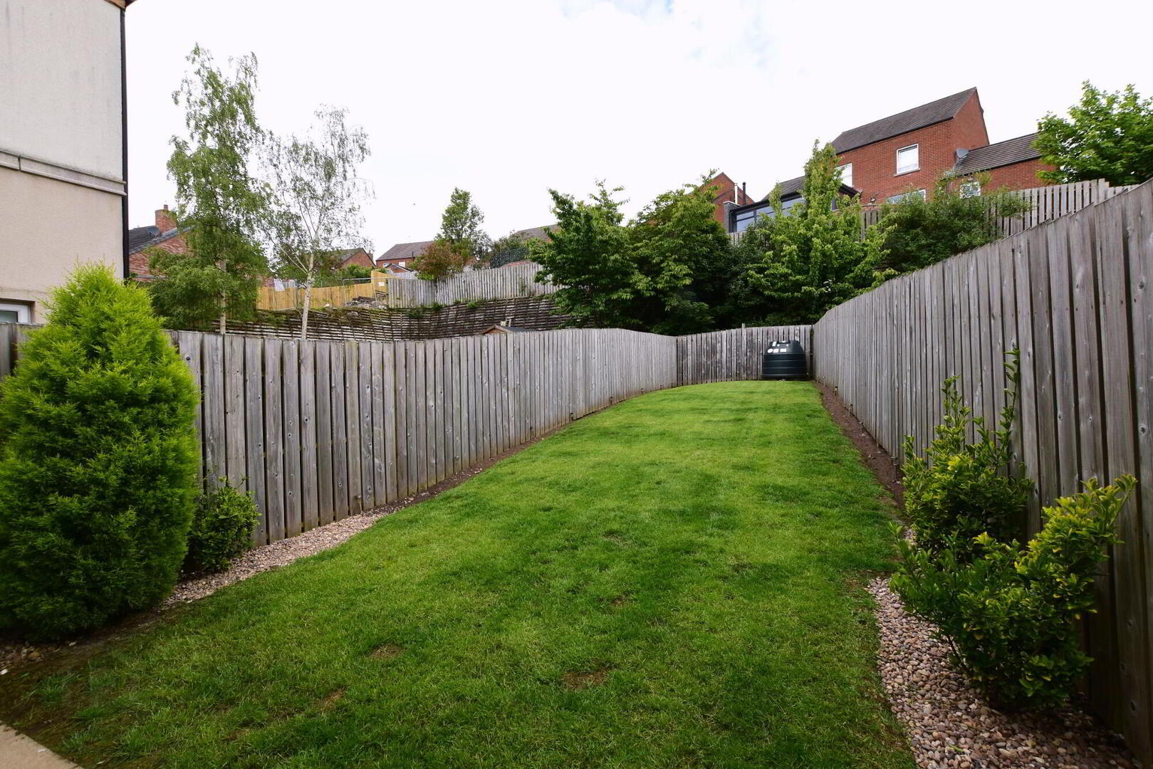 Extensive enclosed rear garden in lawn. Paved patio area. Side gate.