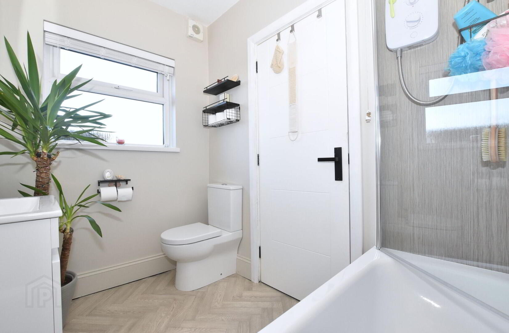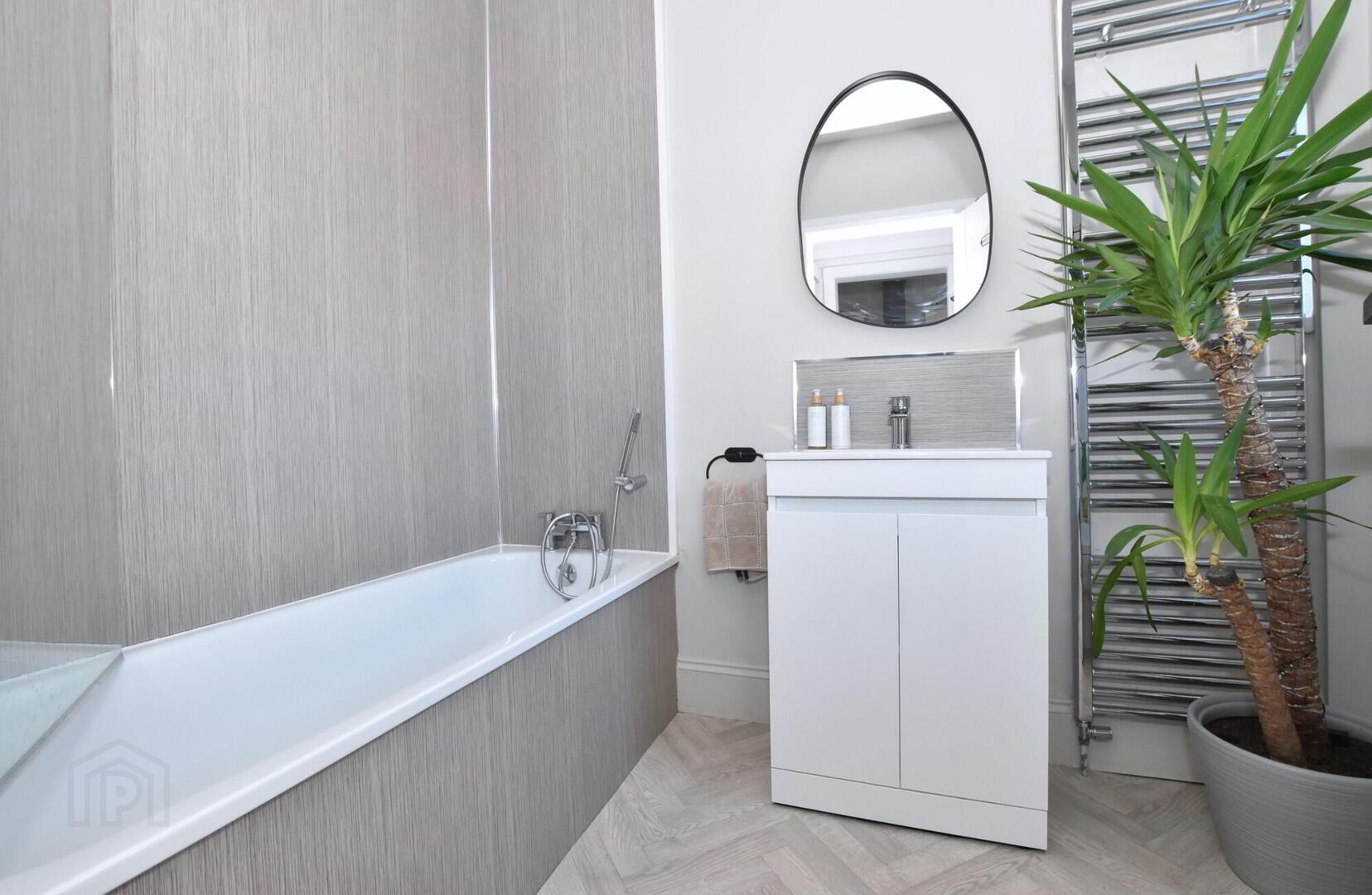 Contemporary white coloured suite comprising: panel bath with chrome mixer taps and shower attachment, electric shower over bath with glass shower screen, pedestal wash hand basin and low flush w.c. PVC waterproof wall panelling. Extractor fan fitted in 2020. Chrome heated towel rail.