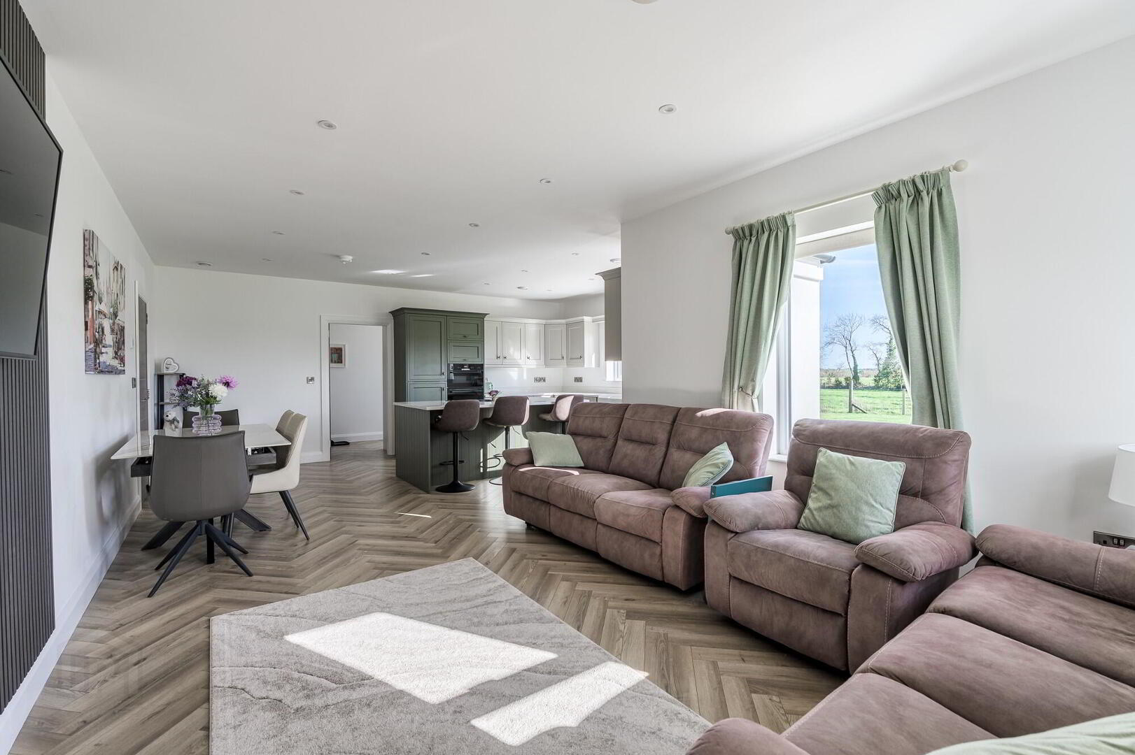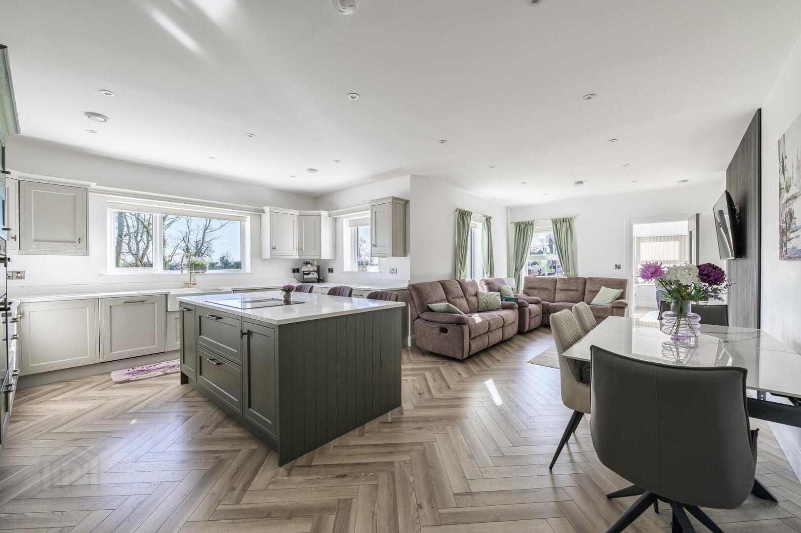 Beautiful Herringbone laid LVT flooring. Feature contemporary wall panelling. Wired for a wall-mounted TV. Low voltage downlights. Glass door to sunroom - Sunroom