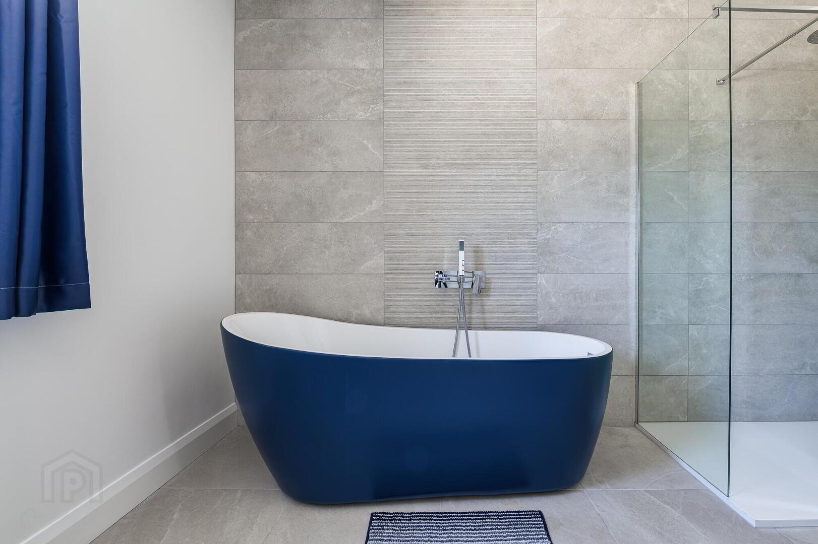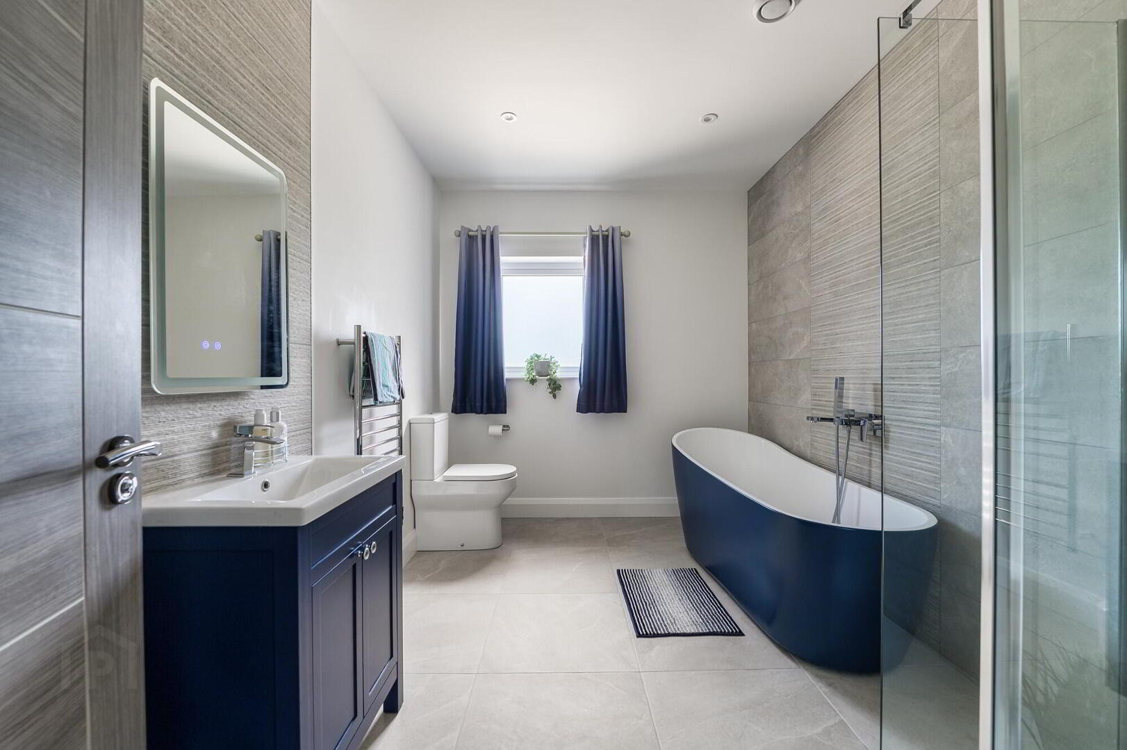 Contemporary white coloured bathroom suite comprising; a modern "slipper" style bath with wall-mounted chrome mixer taps, a vanity unit with inset wash hand basin, a glass fully tiled shower enclosure and a low flush wc. Fully tiled feature wall and splash-back. Tiled floor. Low voltage downlights. Chrome heated towel rail.