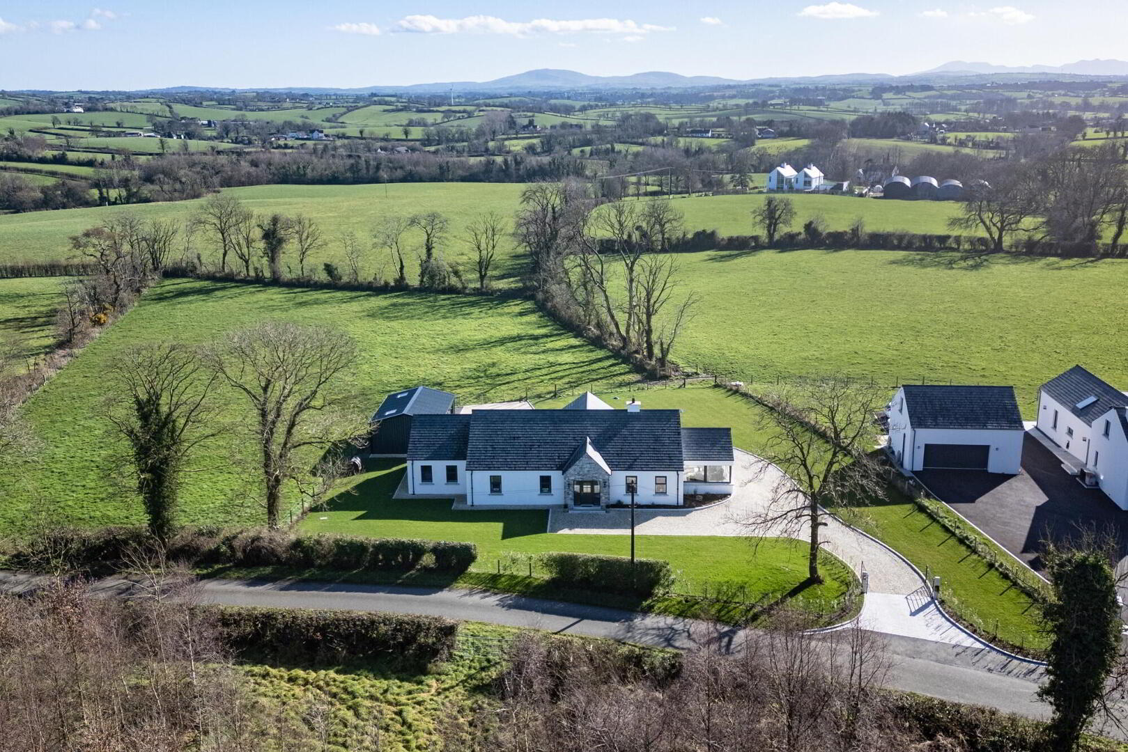 Outside it has lovely well-maintained gardens in lawn with neat granite kerbing, traditional style electric entrance gates and south-facing views towards the Mourne Mountains to the rear.