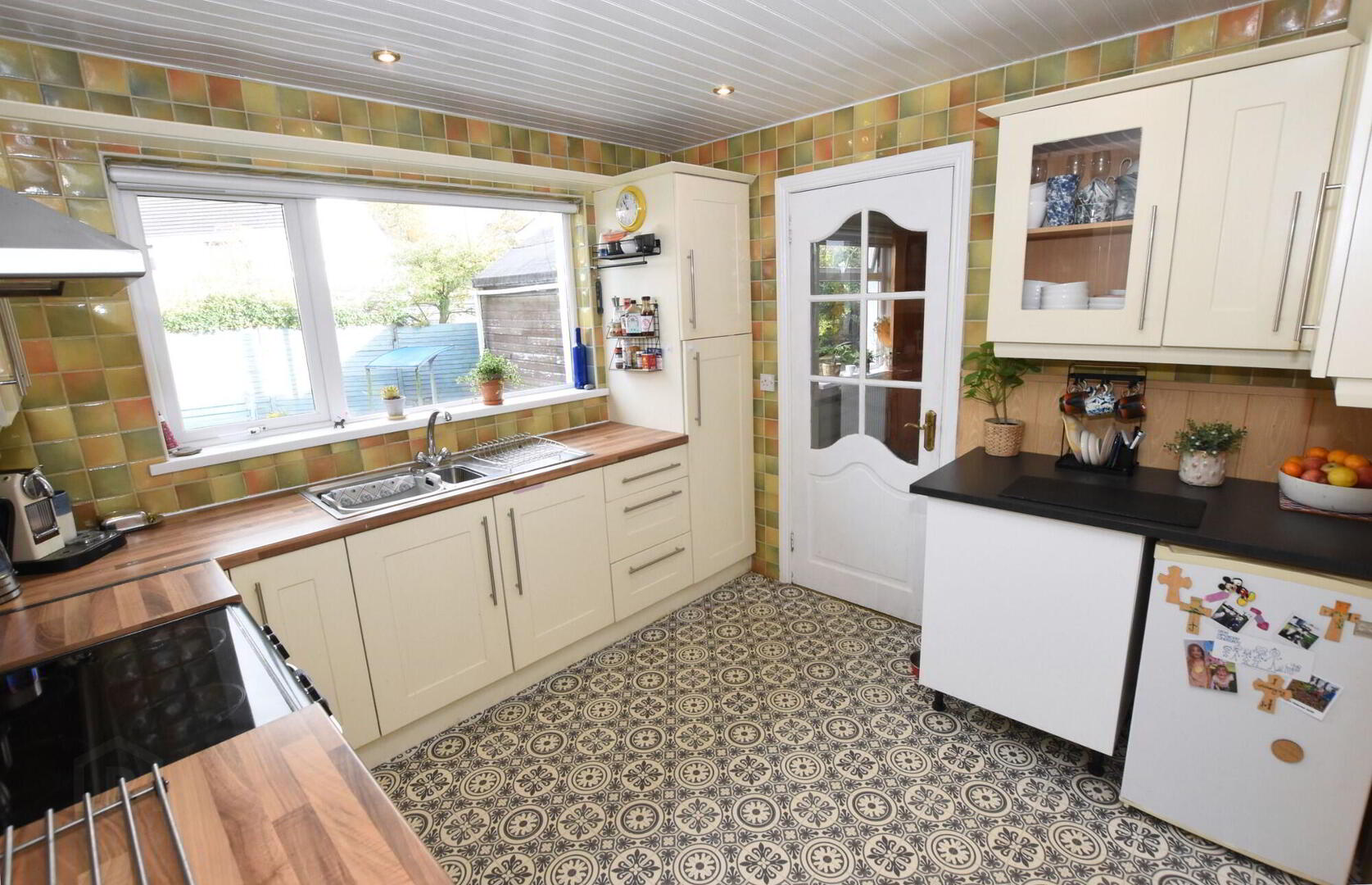 Modern cream coloured kitchen with fitted high & low level units. Part tiled walls. Stainless steel extractor hood. Stainless steel splashback. Space for electric cooker. 11/2 bowl stainless steel sink unit with mixer tap. Space for fridge. PVC easily maintained panelled ceiling with low voltage down lights.