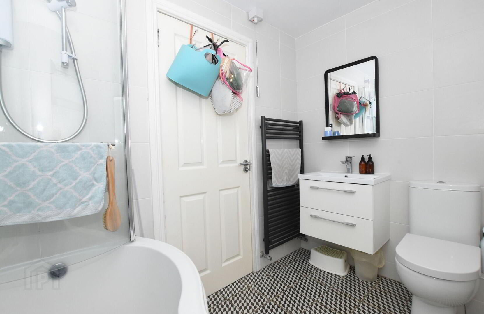 Modern white coloured suite comprising; Panelled bath with electric shower over and curved panelled glass shower screen. Vanity unit with inset wash hand basin with mixer tap. Low flush wc. Fully tiled walls. Low voltage downlights. Tiled floor.