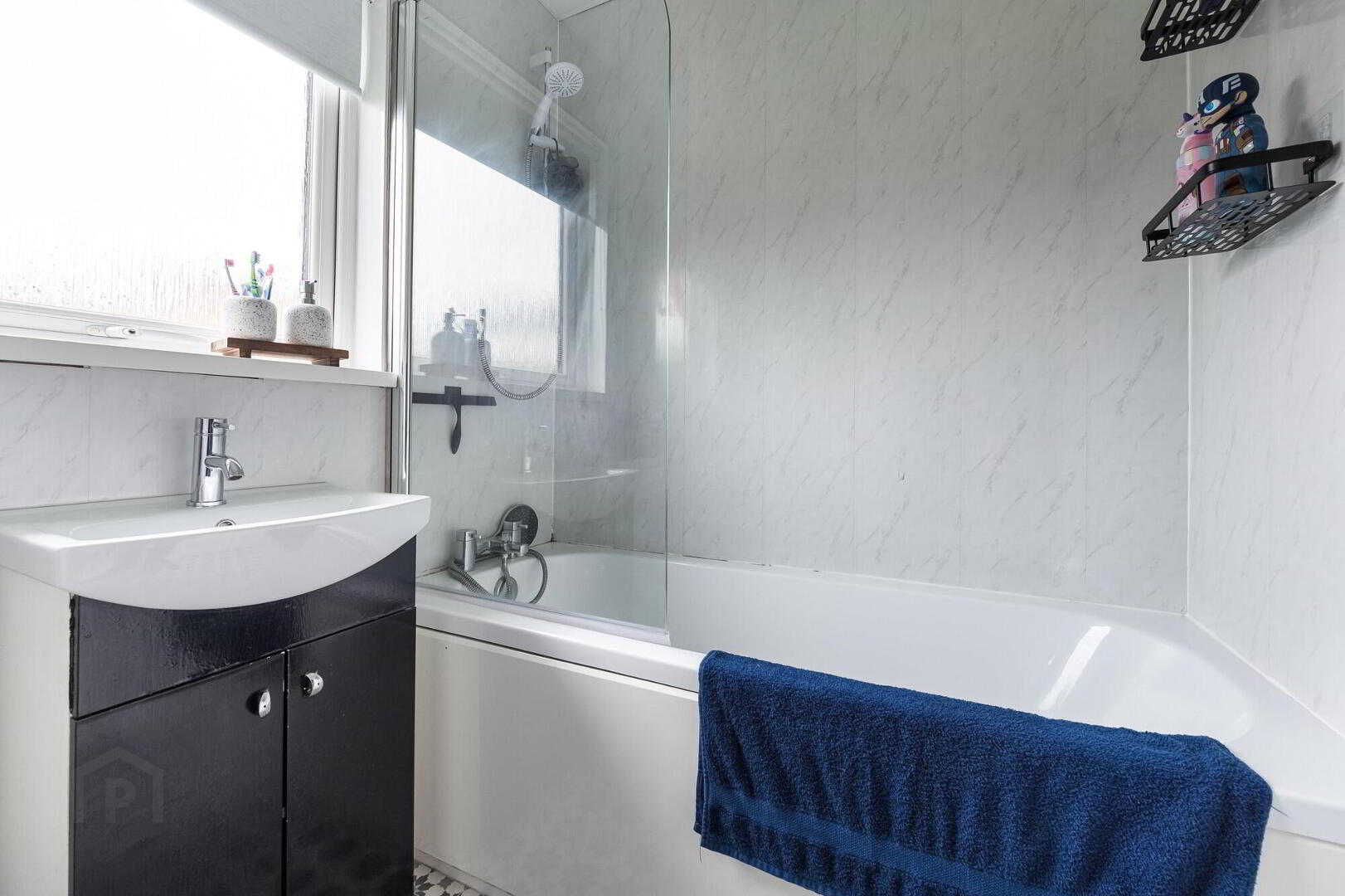 - Modern white coloured bathroom suite comprising; panelled bath with chrome mixer taps and shower attachment, electric shower over the bath and glass screen and low flush wc. PVC waterproof wall panelling. Waterproof panelled ceiling. Chrome heated towel rail.
