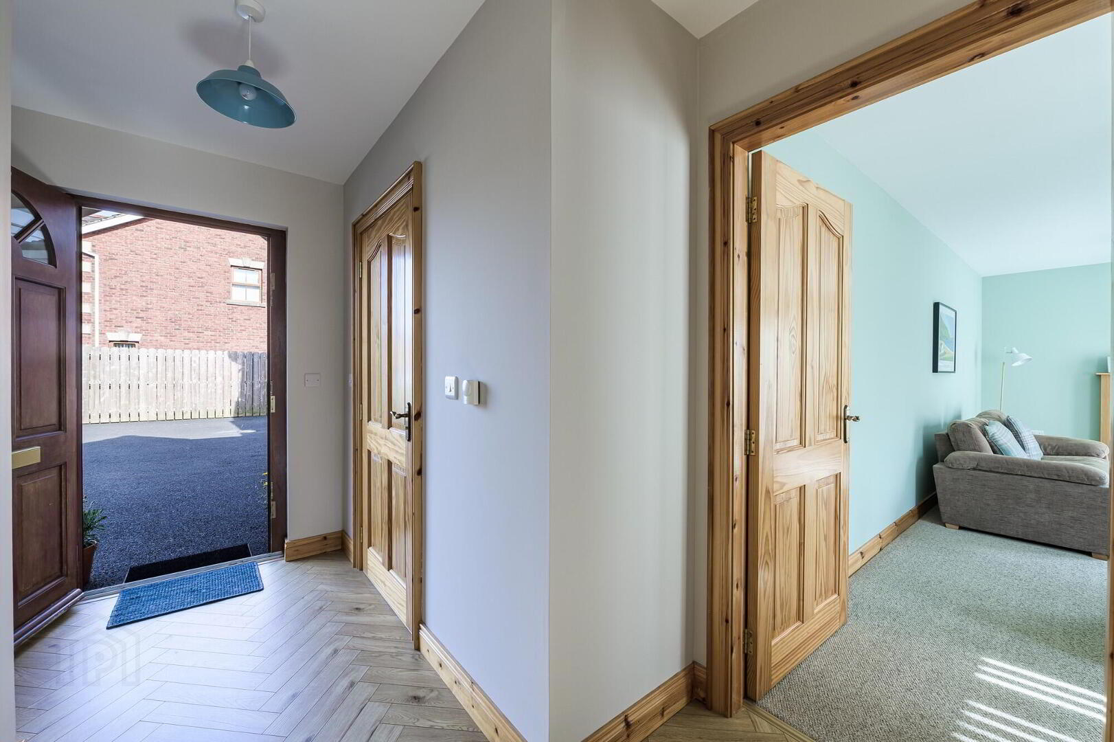 - Hardwood entrance door with glazed panels. Wooden laminate flooring. Staircase to first floor.