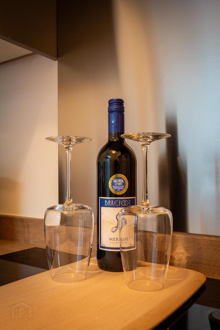Bright and spacious bedroom with quality flooring. Double bed, wardrobe & side table.