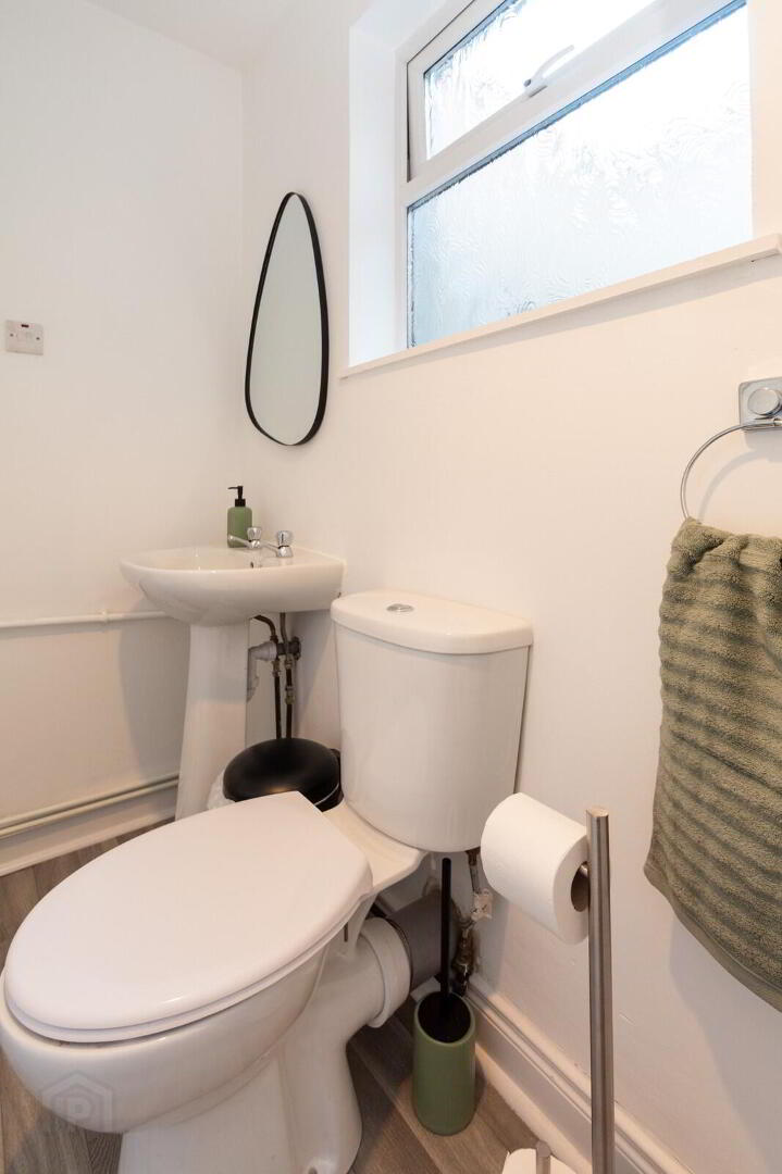 Pedestal wash hand basin. Low flush W/C. Gas boiler. Good quality flooring.