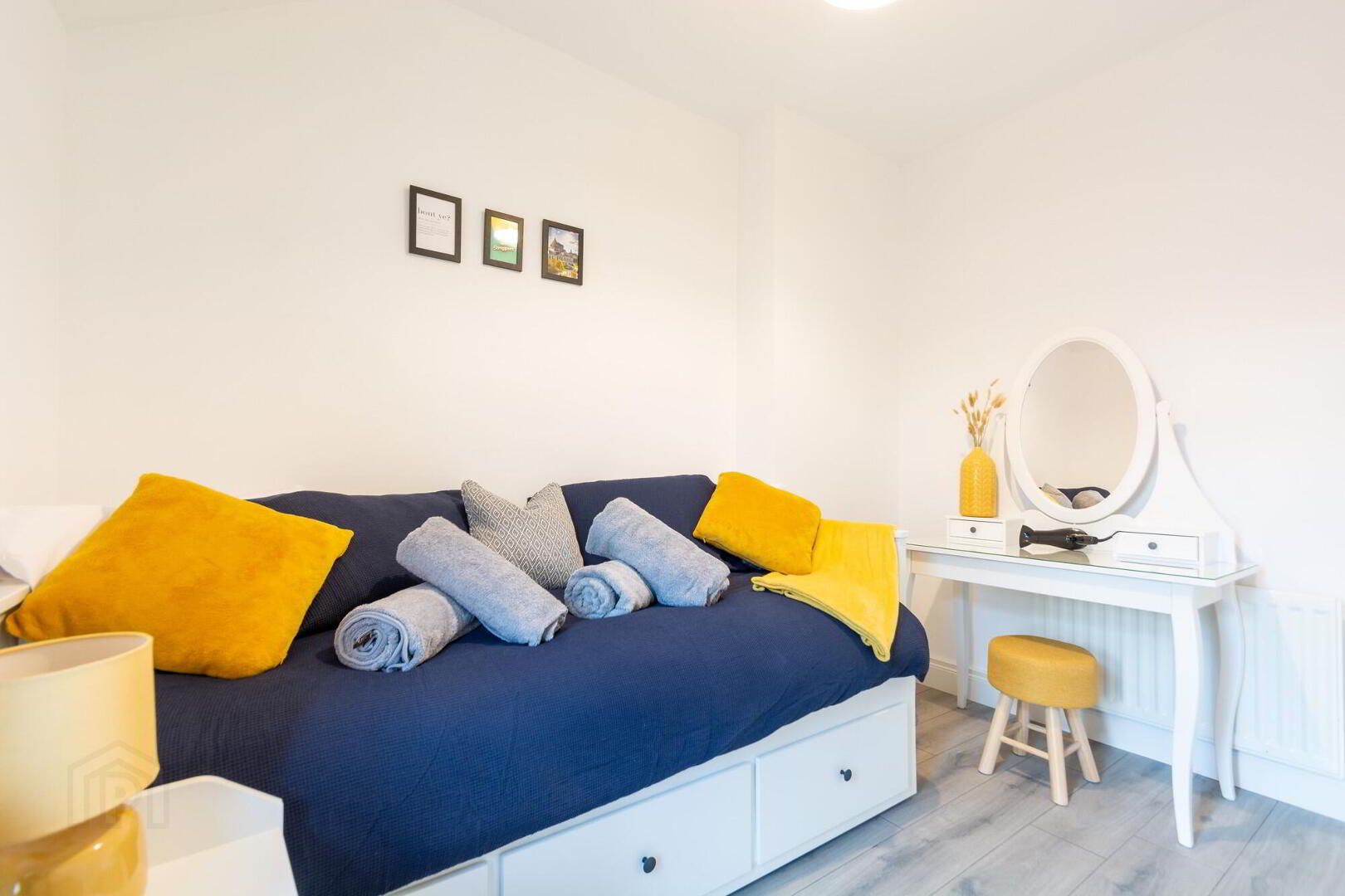 Generous sized bedroom with quality flooring. Day-bed that folds out into a double, bedside table. Desk with mirror attached. Built in clothes rail.