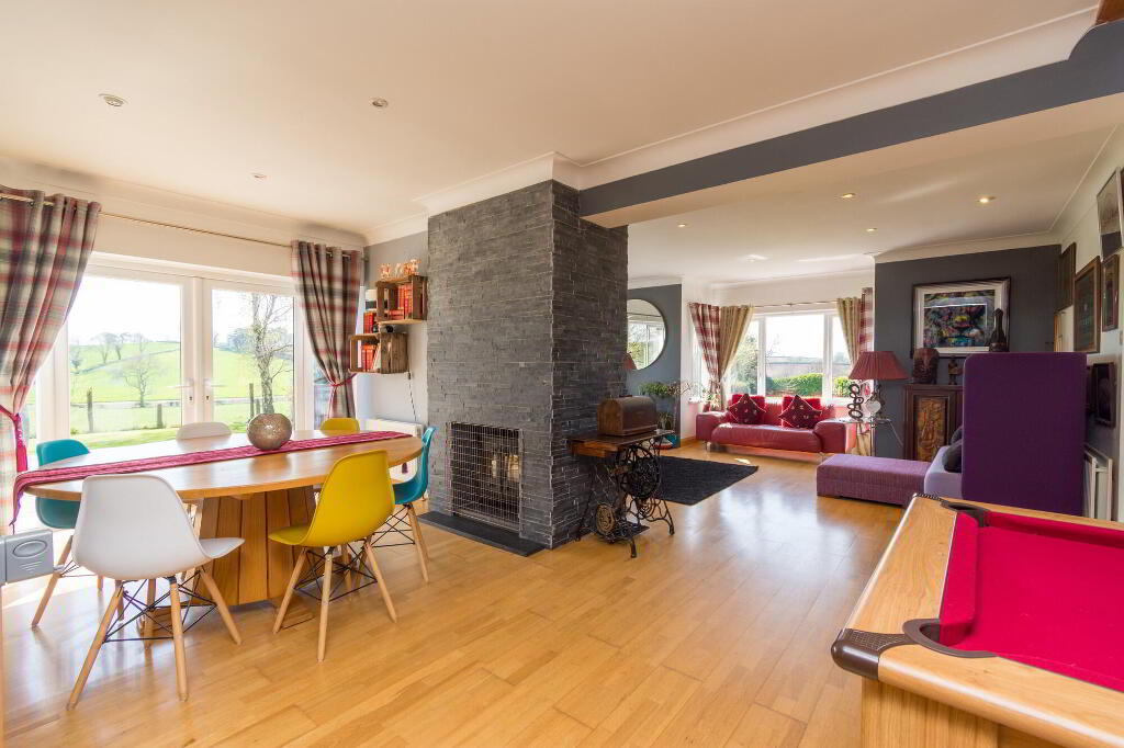 Feature slate fireplace with Morso cast-iron multi fuel stove and slate hearth. Polished wooden strip flooring. Coving to the ceiling. Low voltage downlights. Large picture window offering fabulous elevated countryside views.