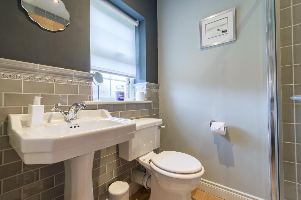 - Modern white coloured suite comprising; low flush wc, pedestal wash hand basin and fully tiled shower enclosure. Part tiled walls by Porcellana Belfast. Solid oak engineered flooring.