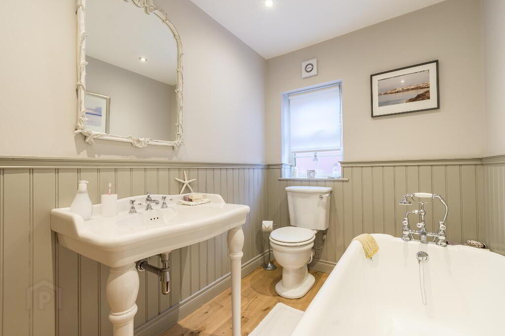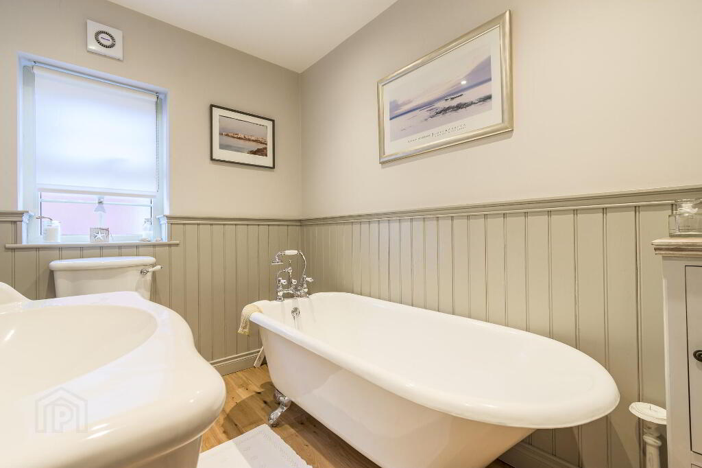 Traditional style "Heritage" bathroom suite comprising; cast iron rolltop bath with chrome telephone mixer taps and shower attachment, low flush wc and wash hand basin. Painted wainscoting to walls. Low flush wc. Solid oak engineered flooring