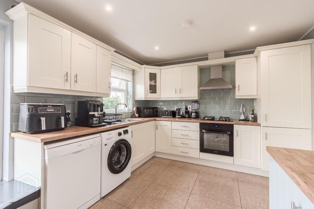 Excellent range of modern cream coloured high & low level units. Stainless steel extractor hood. 4 ring gas hob. Built in under oven. Part tiled walls. Space for fridge freezer. Plumbed for automatic washing machine. 1 1/2 bowl single drainer stainless steel sink unit with mixer tap. Centre island work station / breakfast bar. uPVC double glazed sliding patio doors opening onto enclosed private garden, LED downlights.