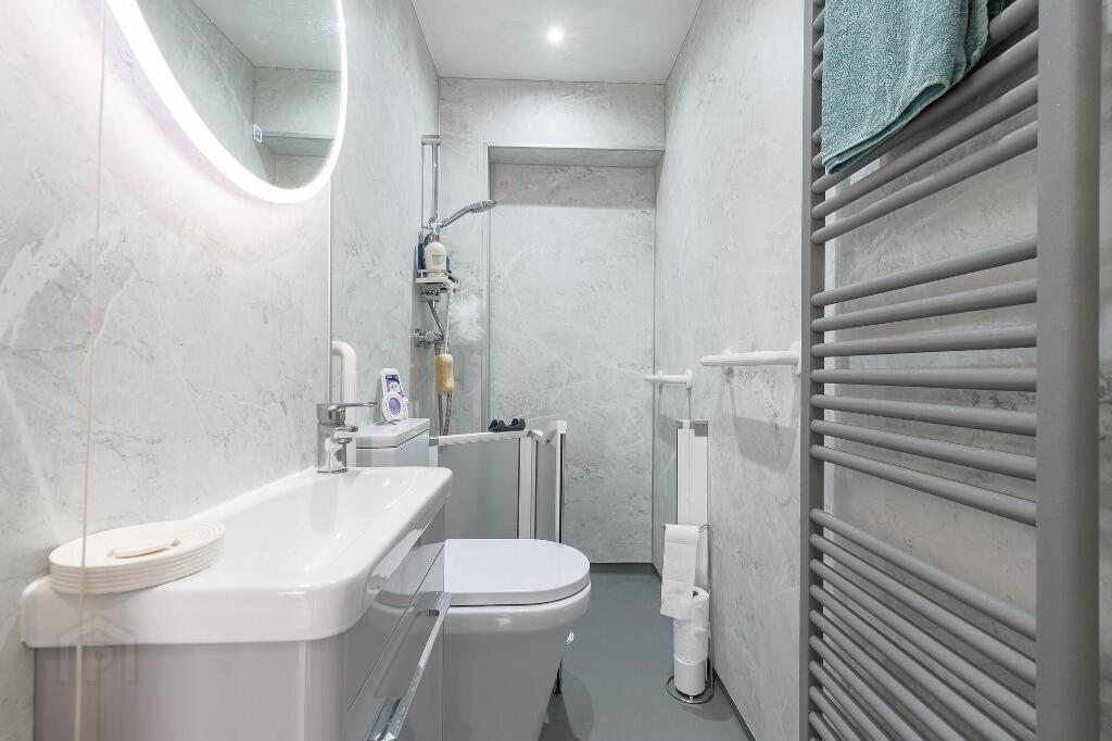 Enclosed shower, low flush wc. wash hand basin with mixer tap set over vanity unit. Tiled floor. Panelled wood PVC walls. LED mirror.