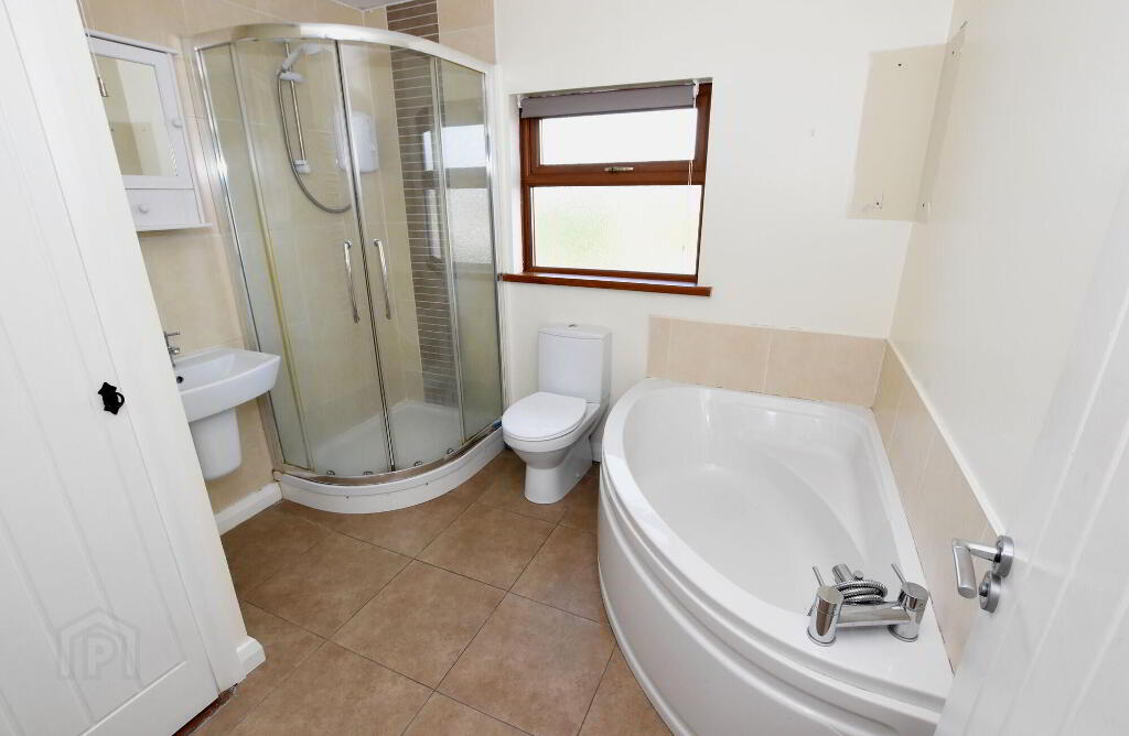 Modern white coloured suite comprising: corner bath with chrome telephone mixer tap & shower attachment, low flush w.c., pedestal wash hand basin, large fully tiled shower cubicle with electric shower, built in hot press, tiled floor, chrome heated towel rail, recessed low voltage down lights.