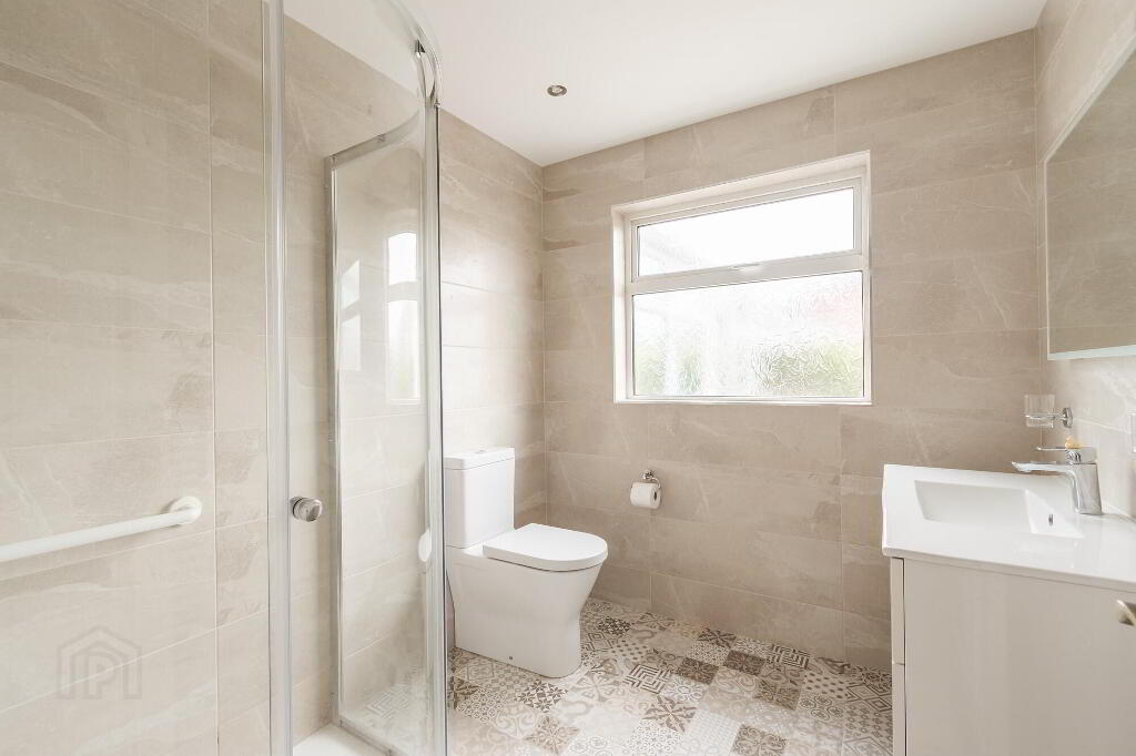 Recently refitted shower room with white coloured suite comprising; large glass shower enclosure. low flush wc, and vanity unit with inset wash hand basin. Fully tiled walls. Tiled floor. Low voltage downlighting.