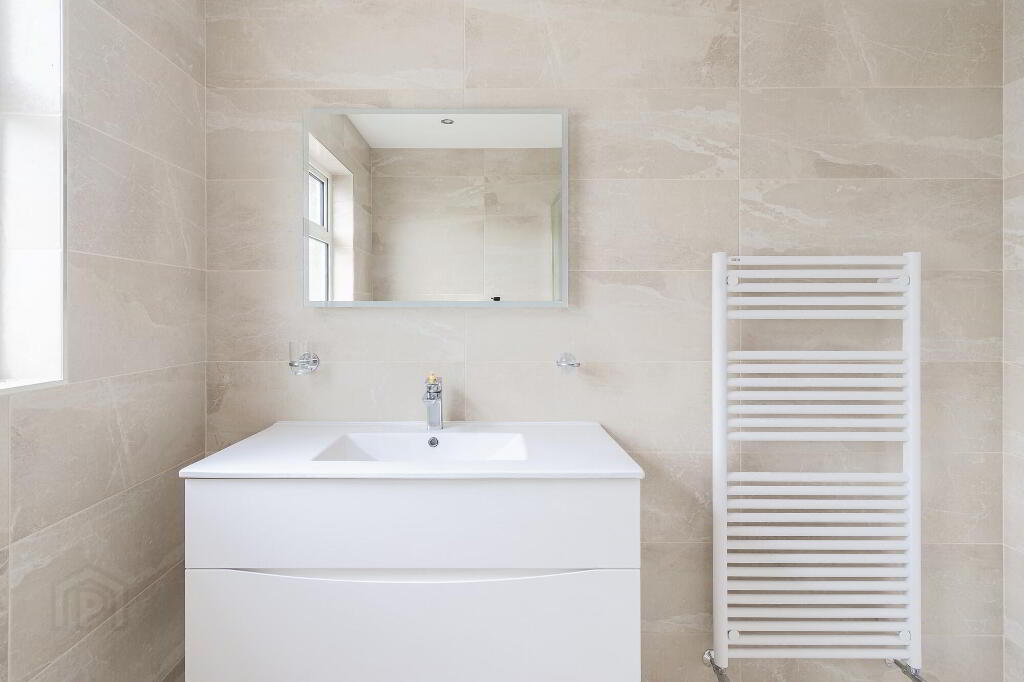 • Modern white coloured fitted kitchen. Contemporary shower room.