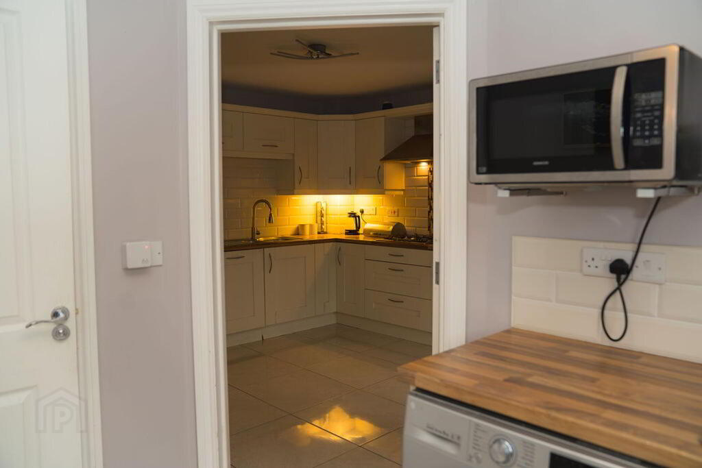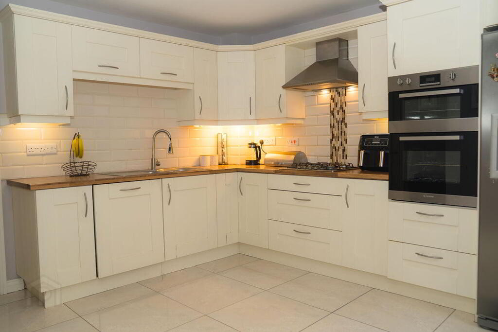 Excellent fitted kitchen with a good range of high and low level contemporary units. Part tiled walls. 11/2 bowl stainless steel sink unit with mixer taps. Integrated 4 ring gas hob, stainless steel extractor hood and built-in double oven. Integrated dishwasher. Space for an American style fridge/ freezer. Tiled floor. Large walk-in understairs storage cupboard.