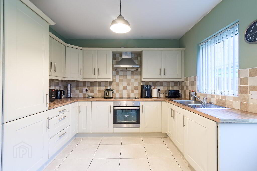 Excellent range of modern cream coloured high & low level kitchen units, stainless steel extractor hood, 4 ring hob, built in oven. 11/2 bowl stainless steel sink unit with mixer tap. Integrated washing machine. Part tiled walls. Tiled floor.