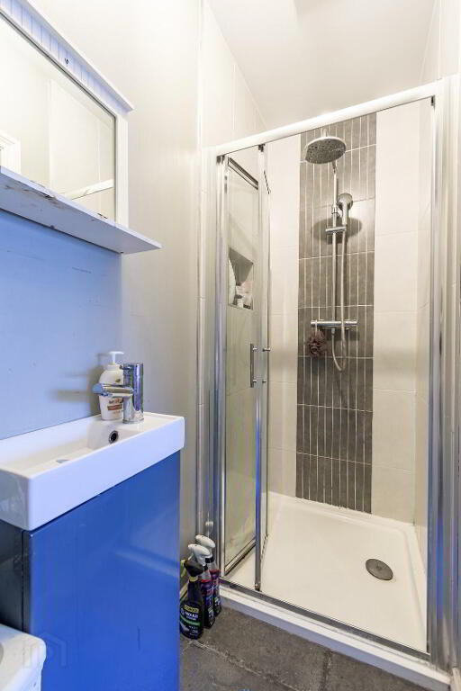 Modern white coloured suite comprising; pedestal wash hand basin, low flush w.c., fully tiled shower cubicle. Chrome heated towel rail.