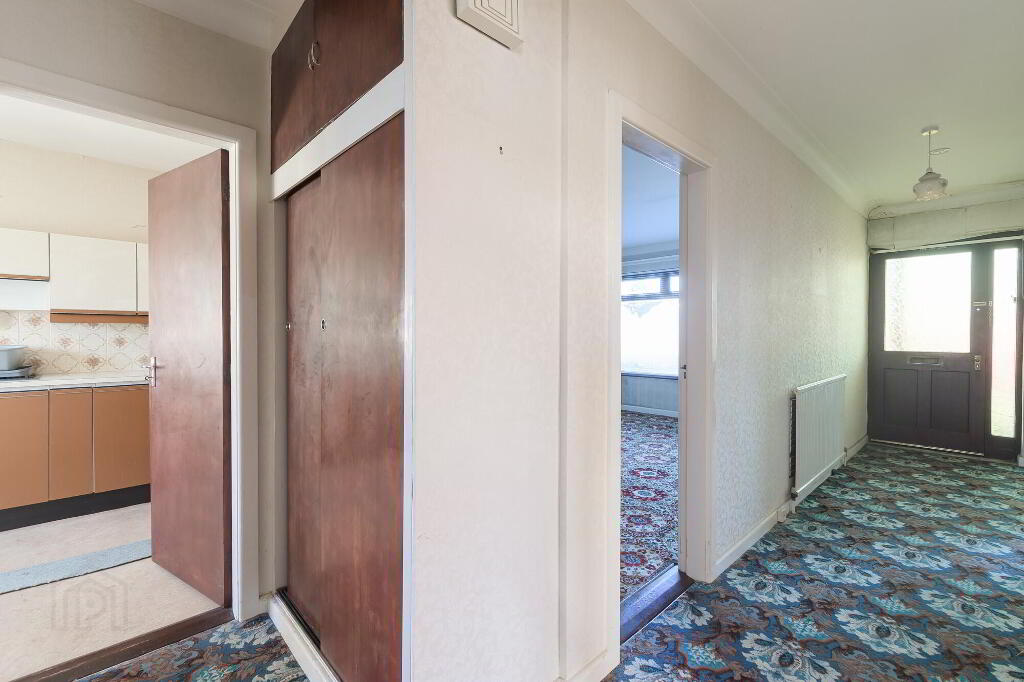Glazed entrance door. Coving to ceiling. Built-in electric box. Built-in cloaks cupboards with storage over. Access to roofspace