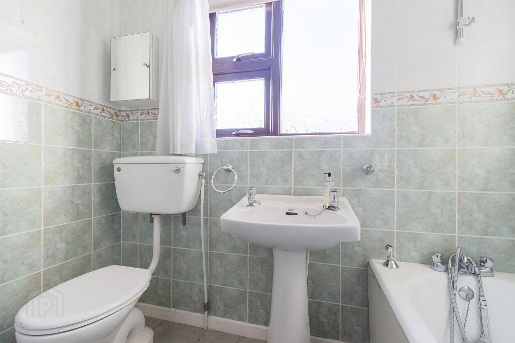 White coloured suite comprising; panelled bath with chrome mixer taps, pedestal wash hand basin and WC. Tiled walls