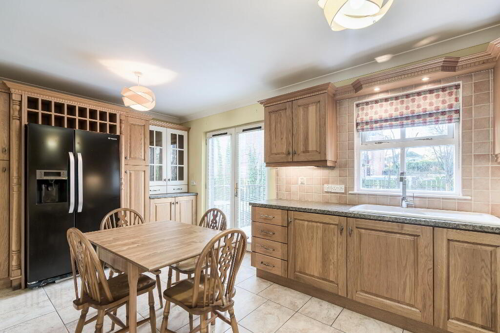 Solid Oak Fitted Kitchen with excellent range of High and Low Level Units. Hotpoint American Fridge Freezer. Extractor Fan. Partially Tiled Walls. 5 Ring Gas Hob. Built In Double Oven. Concealed Microwave. 1 1/2 Bowl Ceramic Sink with Mixer Tap. Integrated Dishwasher. Tiled Floor. Double Glazed Patio Doors to Balcony.