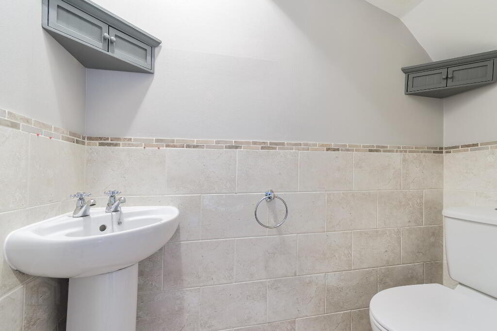 Low Flush WC. Pedestal Wash Hand Basin. Half Tiled Walls. Tiled Floor.
