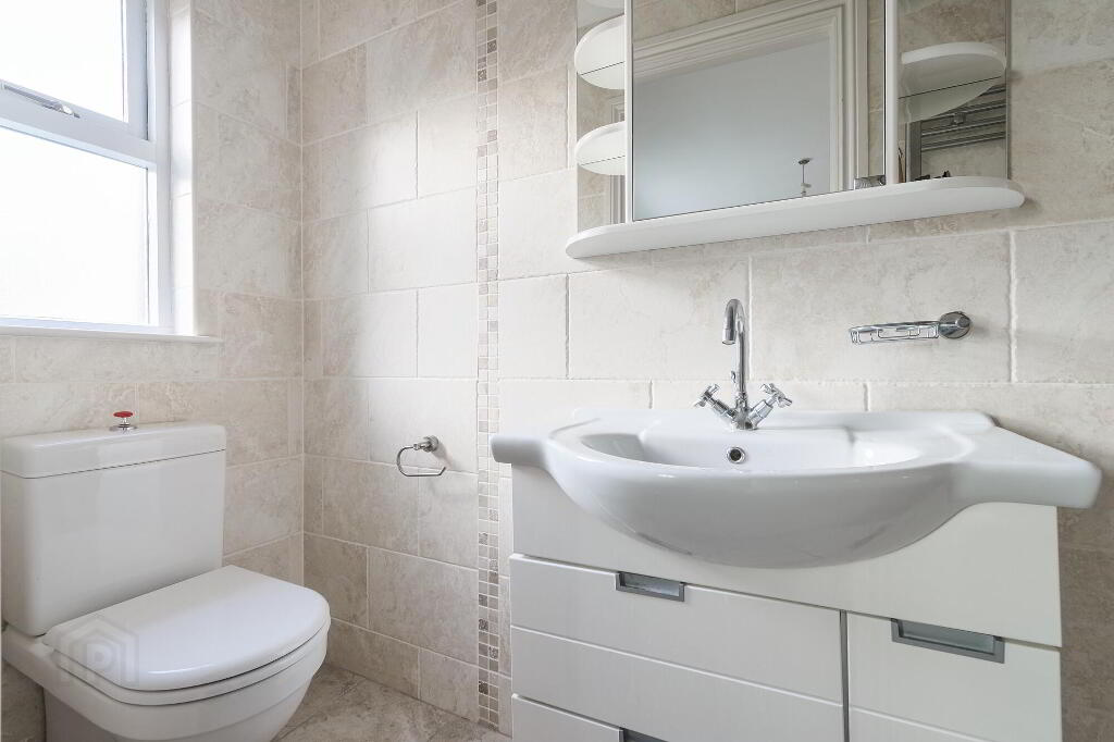 Modern White coloured Suite comprising Glass Shower Enclosure with Power Shower, Vanity Unit with inset Wash Hand Basin and Mixer Tap. Glass Mirrored Cabinet. Low Flush WC. Fully Tiled Walls and Floor.