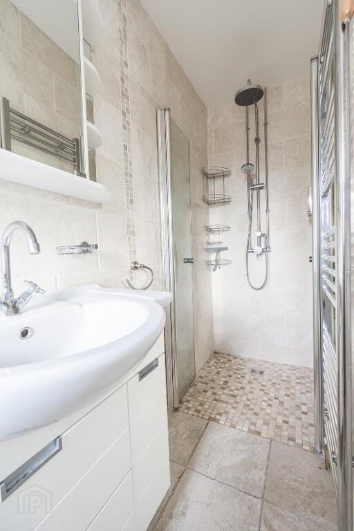 Modern White coloured Suite comprising Panel Bath with Mixer Tap, Glass Shower Screen and Power Shower over Bath. Fully Tiled Walls. Low Flush WC. Tiled Floor. Access to Roof Space.